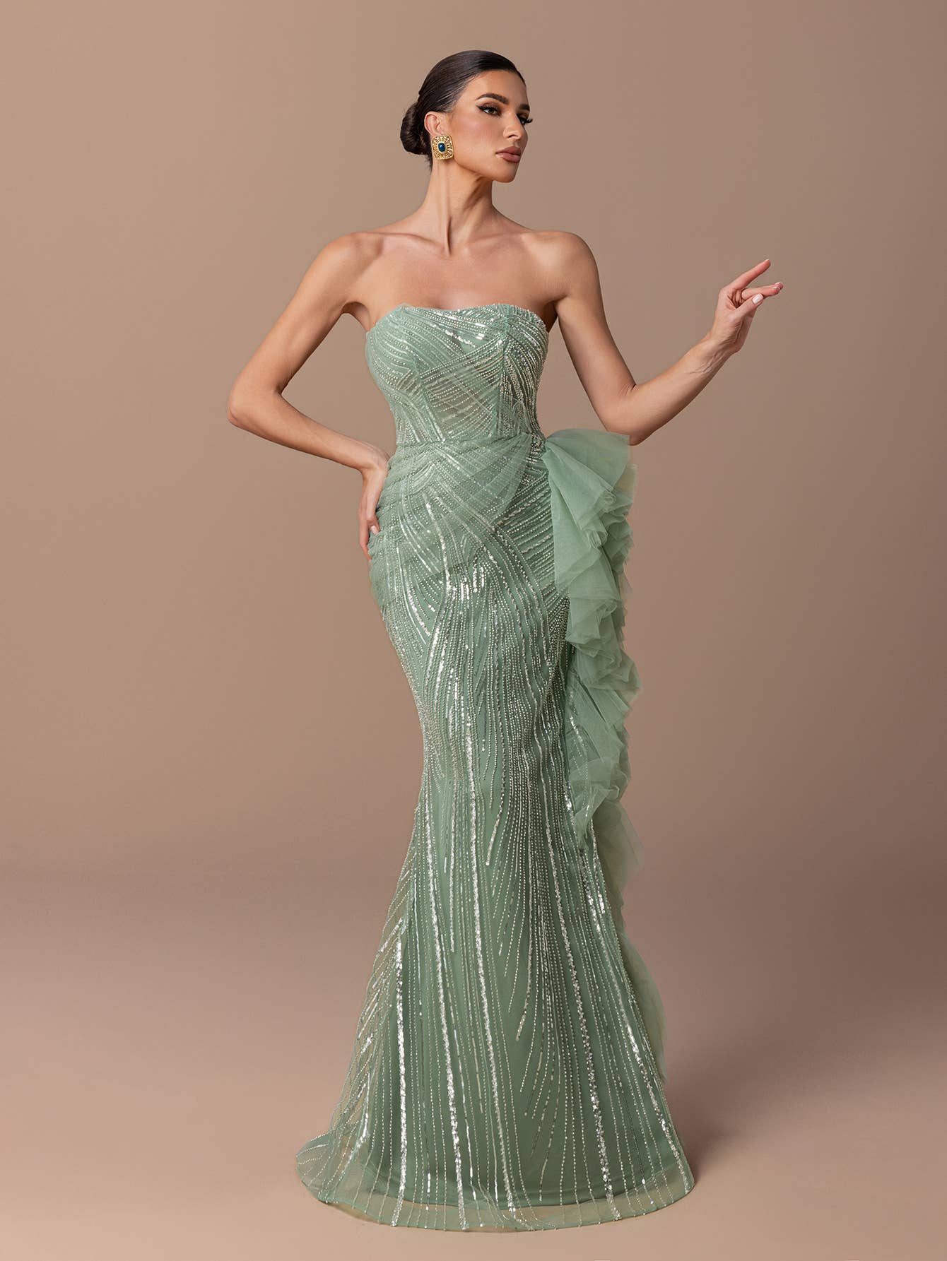 Elevate evening wear with this stunning green halter maxi dress, perfect for dance events. The dress features a captivating halter neckline that ties at the back, offering both support and style. Its fitted bodice accentuates the silhouette, while the flowing fringe hem adds a playful and dynamic movement to every step. Crafted from high-quality fabric, it ensures comfort throughout the night.This eye-catching piece promises to be a bestseller with its unique design and vibrant color.