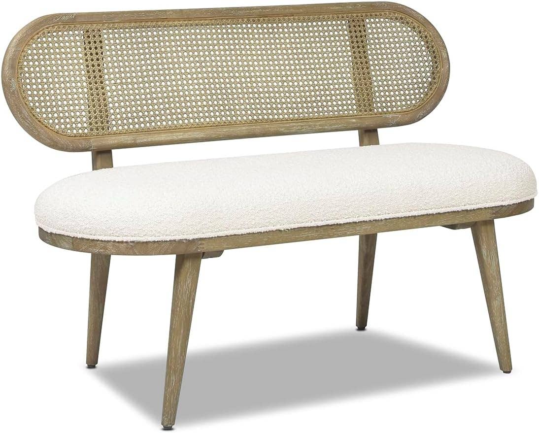 Havana Cane Rattan Upholstered Bench Settee, Ivory