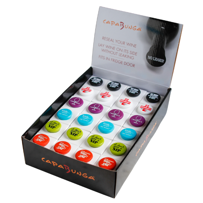 Maximize impulse buys and seasonal sales with our Wine Cap Counter Display Unit (CDU). These reusable wine caps are perfect wine accessories for Christmas gifts, stocking stuffers for adults and make great wine gifts for gift giving all year round. Details: ● High Capacity: CDU holds 48 single wine caps, 24 in each layer, designed to reseal wine bottles so open bottles can lie on their side without leaking and fit in the fridge door. ● Variety of Styles: Available in six styles -– I don’t give a SIP, Instant HAPPINESS just add Wine, Calling all WINE LOVERS, Hmm… let me DRINK about it, The pleasure is all WINE, Rise & Wine” ● Fits perfectly into Gift Baskets ● Competitive Pricing: Wholesale at $2.75 per unit and retail for $5.95 each. Some even sell 4 for $20 and really see them churn even faster! **Cap design subject to change if one design is out of stock. Founded by wine and food industry veterans Walt & Maire, CapaBunga creates functional products inspired by California’s wine country living, enhancing the way you shop, cook, dine, and entertain.