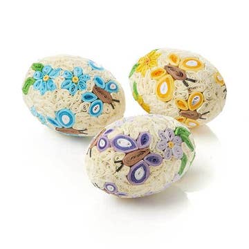 Colorful, eco-friendly, and completely one-of-a-kind, this set of 10 handmade Easter eggs transforms reclaimed materials into vibrant seasonal décor. Each egg begins with a sturdy corrugated cardboard base, carefully shaped by hand and wrapped in beautifully patterned upcycled sari fabric. Each set comes packaged in a reusable cotton storage bag for easy display year after year. Artisans thoughtfully select and apply reclaimed sari textiles—giving new life to richly colored fabrics that might otherwise go to waste. The result is a stunning assortment of textures, prints, and hues, with no two eggs ever alike. From bold florals to intricate traditional patterns, each Easter egg set offers a joyful surprise of color and craftsmanship. Lightweight yet durable, these handmade Easter eggs are perfect for decorative bowls, spring centerpieces, Easter baskets, or tabletop displays. Their sustainable construction makes them an environmentally responsible alternative to mass-produced plastic décor. Because each egg is made from repurposed sari fabric, colors and patterns will vary widely—allowing artisans to create a beautifully unique assortment just for you. Every purchase supports fair trade artisans, helping provide sustainable income, safe working conditions, and opportunities to preserve traditional textile skills while reducing textile waste. Dimensions: 2"h x 1 1/2"dia