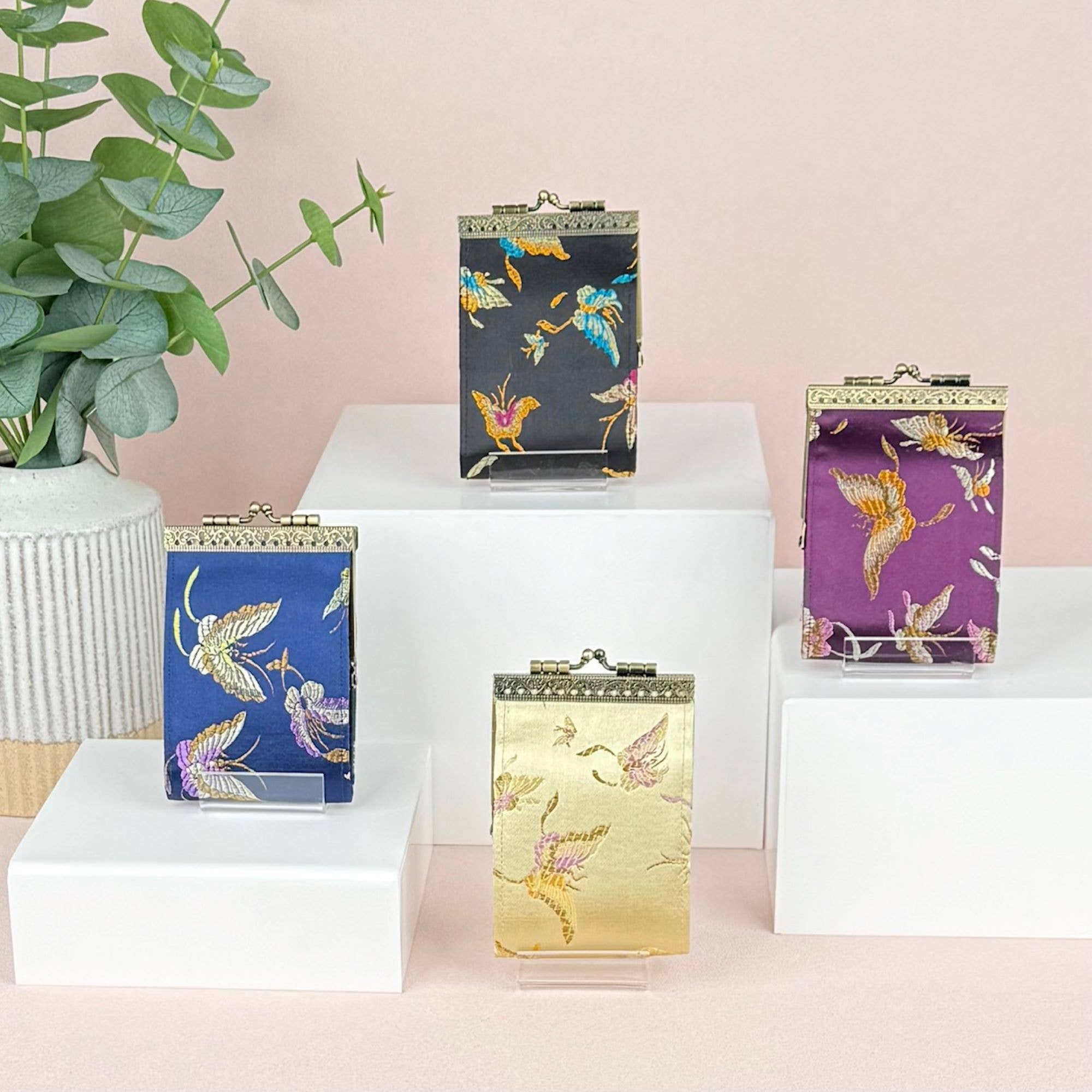 - Accordion-style credit card holders with RFID protection. - Easy to open and close with a kiss clasp. - The pleated slots can hold 8-10 cards. - Made with synthetic brocade fabric