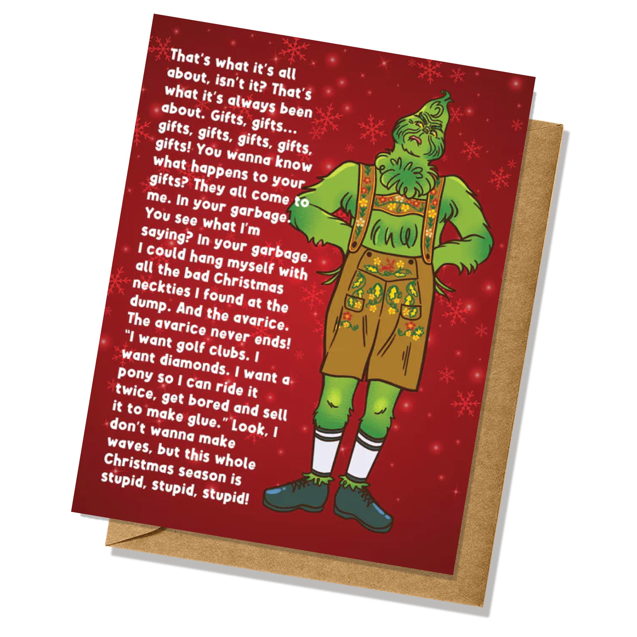 Ol' Frankie doesn't understand much, but he does enjoy a good cup of hot cocoa and a lively holiday celebration. Although He stays far away from the yule-log. Don't bore your loved ones and co-workers with some store-bought mass-produced lameness. These cards are professionally printed on high quality luster greeting card stock and are sure to be the most unique card on the mantel. Each card measures 5x7 inches and are blank inside so that you can truly personalize your message. Every card comes with a matching envelope.
