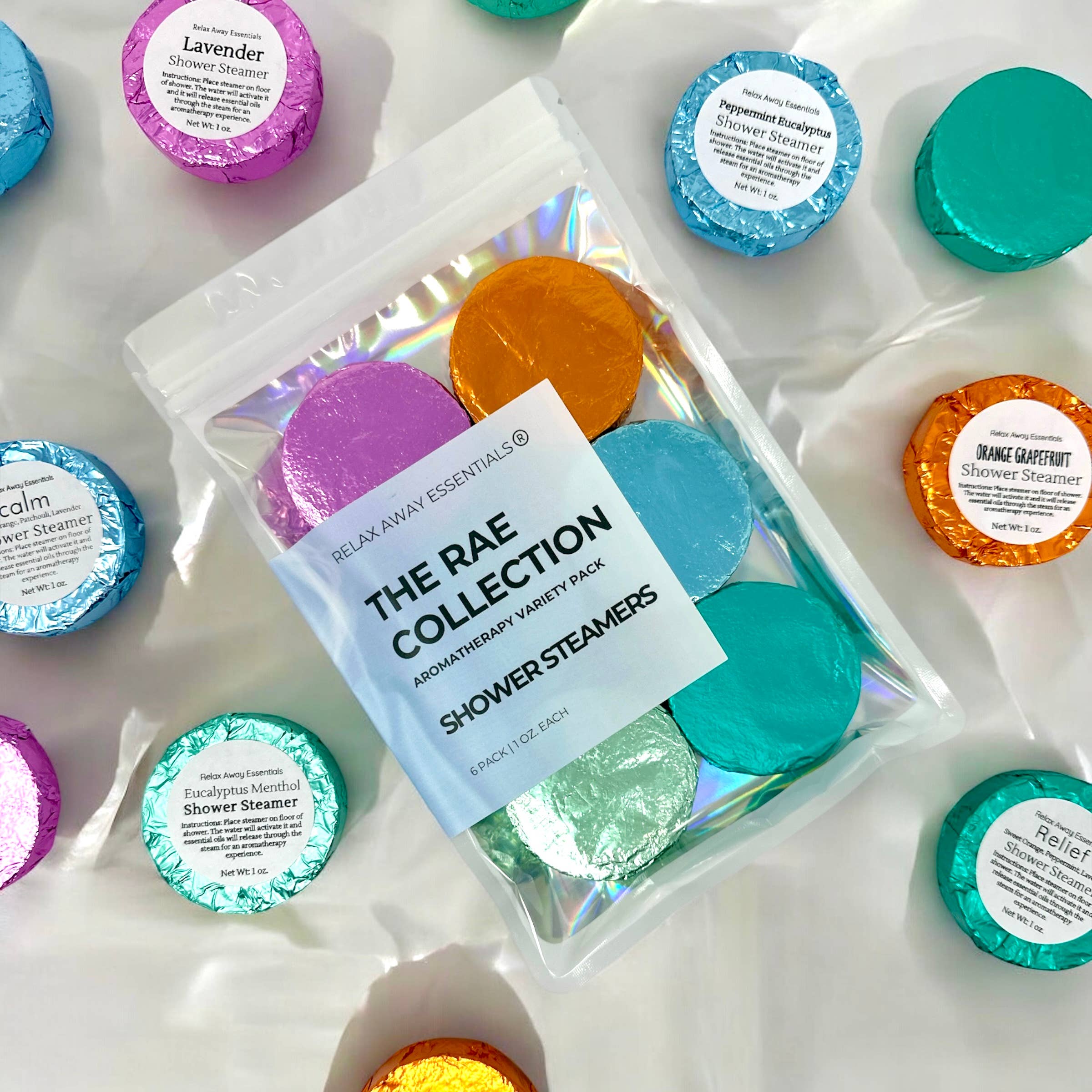 Our Shower Steamers are Handmade in Hillsboro, Missouri using clean, simple ingredients only. -Each shower steamer is dye-free -Individually wrapped with instructions -About 1 oz. each , 2 inches in diameter and about a half inch thick -6 Shower Steamers in a Resealable Pack Frost & Fir -White Woods - peppermint, pine, tonka bean -Fluffy Mint - peppermint, spearmint and sweet marshmallow -Arctic Breeze - peppermint and menthol