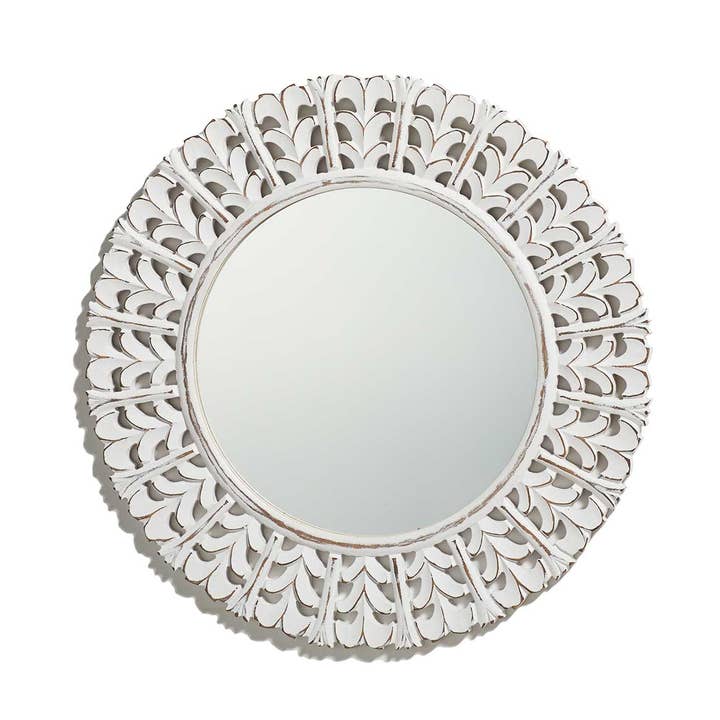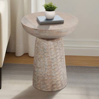 Refresh your home decor with these beautifully hand-carved side tables! Artisans meticulously carve sustainable mango wood by hand, then whitewash each for rustic appeal. Legs are carved from MDF wood, which is made of durable wood waste. Use as a set of wooden night stands, or as unique side tables in a living room! Tables are packed flat; assembly required. Set of 2. 20"h x 20"dia To assemble: Twist legs into one of three openings on each tabletop.
