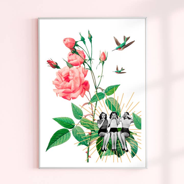 A collage saying no to nuclear weapons. International news freezes us and Florae tries to respond to this emotion with an explosion of flowers and rays in gold ink in the midst of soldiers. A pacifist poster printed in France on 270g matt white paper with golden ink spokes. The poster is sold in a white pouch with a clear window with the hot-gold logo, ideal for in-store presentation.