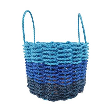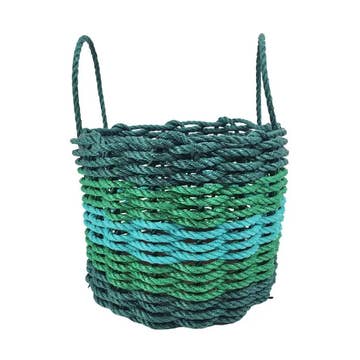 This is a colorful handmade basket, woven with the very same rope that fishermen use to tend their gear here on the coast of Maine. Lobster rope is extremely durable, lasting against strong tides and storms at sea, while the colors are vibrant and long lasting as well. Available in three different Sizes *9x9 inches *16x12 inches *16x18 inches *We even offer a bundle of 1 each size! Blue Gray and Seafoam Color
