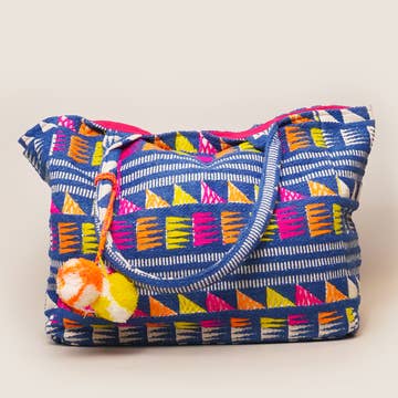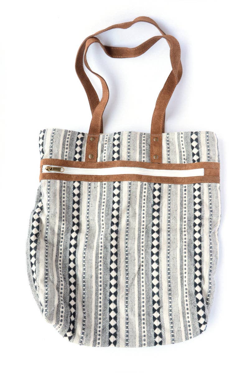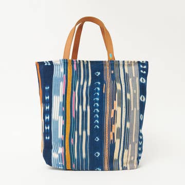 Our totes are always large enough to hold a laptop with pockets to help keep you organized. Handmade from recycled fabric and suede by women in India. Zipper top with a zipper pocket and two open pockets inside. This purse measures 14" wide and 15.5" long with 24" straps. Navy blue cotton lining. This navy and orange tote is the perfect blend of style, functionality, and ethical fashion. Handmade with love by talented women artisans in India, each tote is crafted from recycled fabric and suede, giving it a unique and eco-friendly touch. By supporting our India Collection, you are also supporting fair trade practices that empower these talented women artisans. Make a conscious choice, shop fair trade, embrace style with substance, and make a positive impact on both people and the planet. Learn more about the women who make the products in our India Collection.