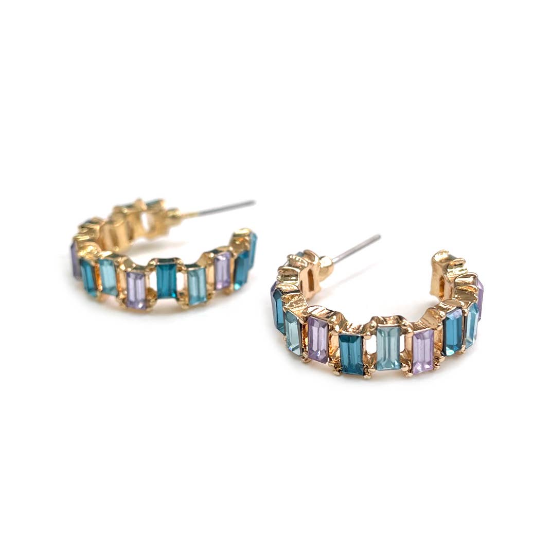 What are your go to pieces for a night out? This may become one of them! Our sparkly hoops are 1 1/4" in diameter with tightly set marquise shaped stones forming a constellation of stars that glitter and catch the light. Available in either a cool combo in pale purples and blues or in a warm combo in reds, oranges and yellows Brass plated in 18K gold with cubic zirconia stones. Surgical steel posts to keep our metal sensitive friends safe.