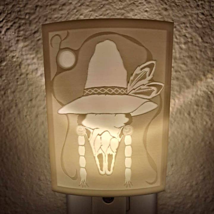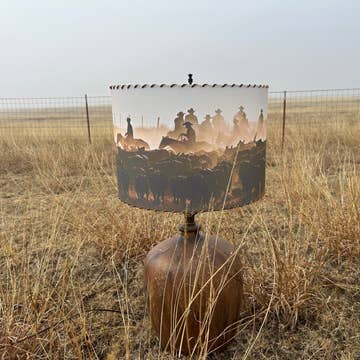 3d printed lamp shades with prints of art by Shana Yellow Calf, enrolled Northern Arapaho artist. These lamps are made from PLA plastic, a non-toxic, renewable material and environmentally friendly. The lamps are easy to clean, and each one tells a story. Lamp shades are approximately 10 inches height and 9-10inches across. They illuminate any room and add art to rooms in a new and exciting way. Title - Sisterhood **Each order comes with one sample lamp to showcase in house** **Complete Lamps sets available upon request to sell at wholesale-(lamp shade and base, please inquire about pricing)***
