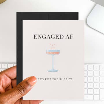 Engaged AF and ready to celebrate! This chic and sassy engagement card is perfect for popping the bubbly and toasting to love. With a stylish champagne glass illustration with bubbly details, set against a clean ivory background. Ideal for retailers who cater to modern, fun-loving customers. Card reads: "ENGAGED AF" and "Let’s pop the bubbly!" DETAILS: • Size: A2 (4.25 x 5.5”) • Blank inside for a personal message • Printed on eco-friendly, recycled paper • Made in the USA • Paired with a sleek black envelope CATEGORIES: Engagement Cards, Celebration Cards, Love & Romance