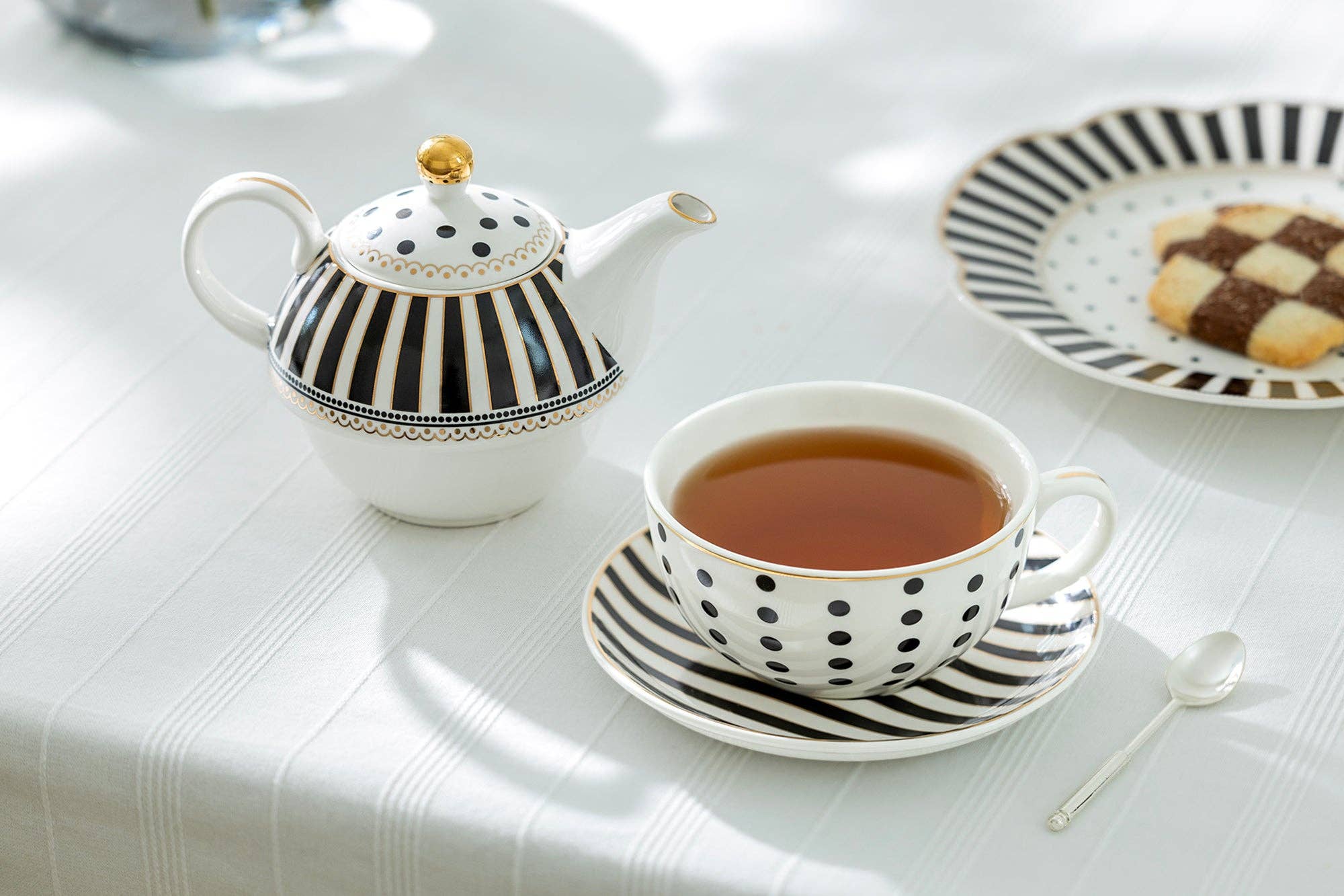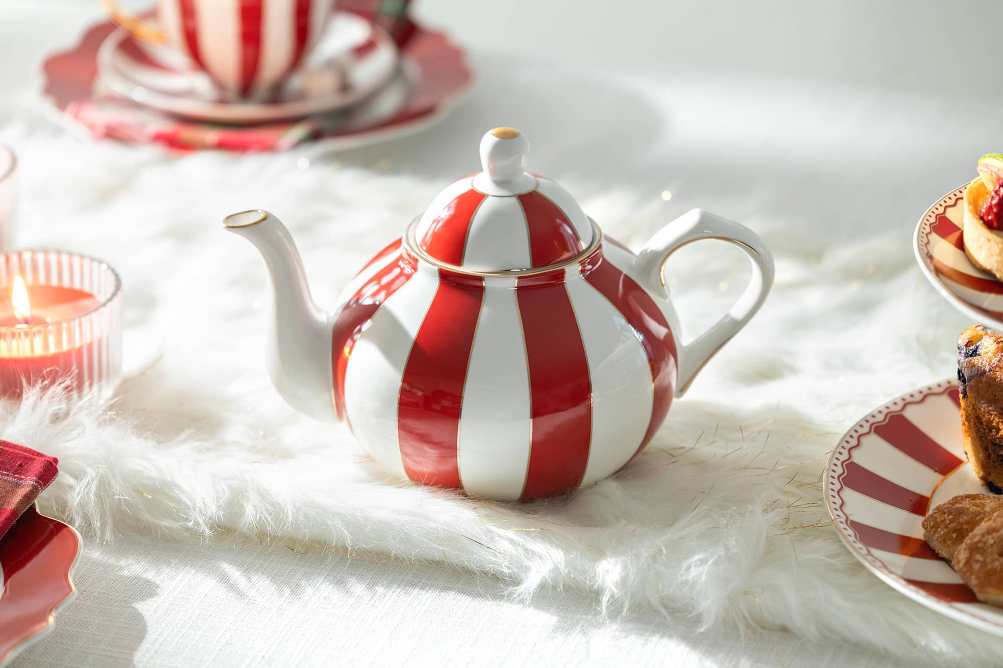 Each set includes - 1 teapot, 1 cup with 1 saucer Specifications Overall Height: 6” Teapot Dimension: 4.3” Height x 6.5" Width x 4.15” Depth Capacity - 18oz Cup Dimension: 2.15” Height x 5.15” Width x 4.15” Depth Capacity - 8oz Saucer Diameter: 6" Material Porcelain with gold trim Care Advice Dishwasher Safe Hand wash recommended Not microwave safe due to gold trim Grace Teaware Red Carousel Stripes Fine Porcelain Tea For One Set