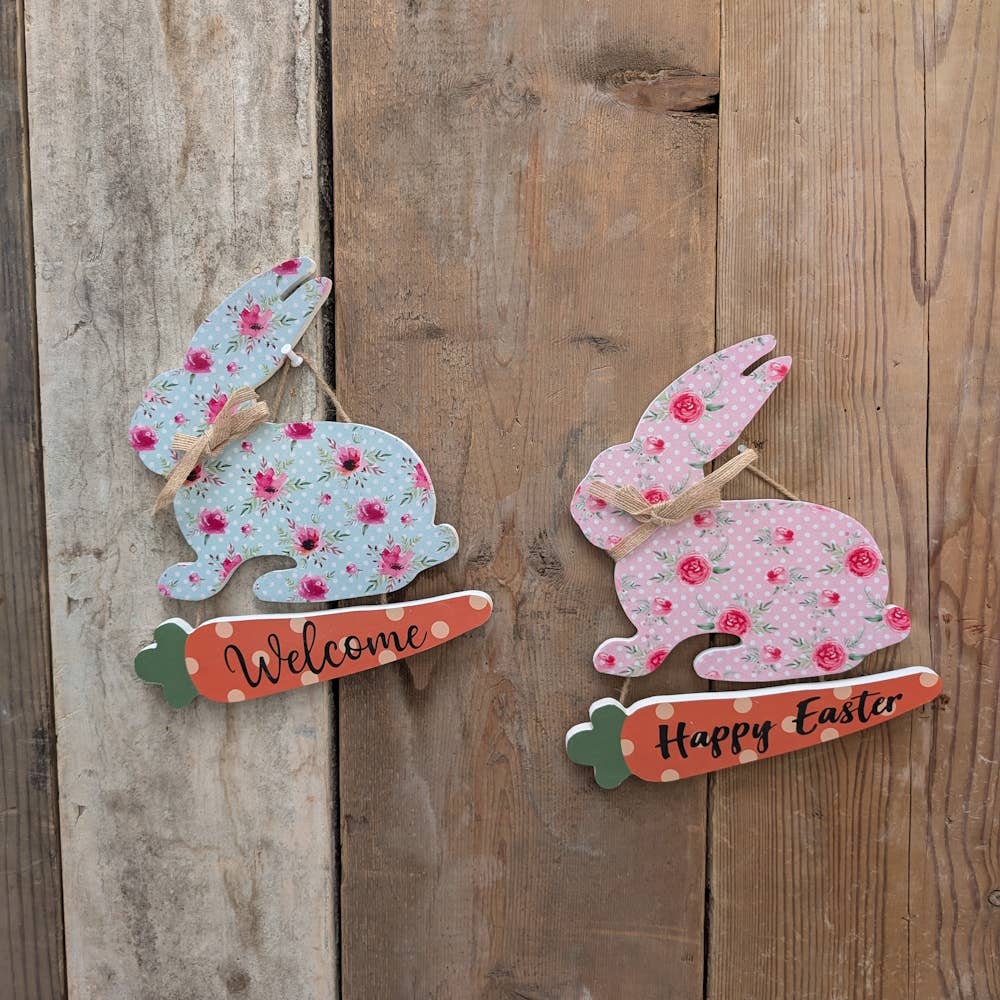Add a pop of fun and color this Easter season with this rabbit doorhanger or yard stake! This metal home decor is cut into the shape of a bunny with carrots and painted with a polka dot pattern. It comes in tan and gray. All of our door hangers are cut from 1/8" thick aluminum composite sign material, and printed with UV and weather-resistant ink to provide you with a full color image that prevents fading and scratching for years to come!