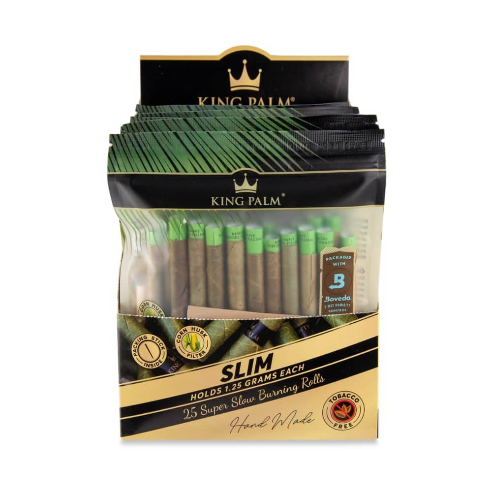 King Palm natural palm leaf tubes are our top choice for wraps! Each one is done by hand by a master artisan and has a corn husk filter that cools when bitten down on. King Palms are the world’s first palm leaf tubes and are completely biodegradable. These leaves come from the Cordia tree, which produces an abundance of leaves that are quickly regrown after being picked by farmers. King Palm filter tips are environmentally friendly, too! Made from 100% corn husk, the dense fibers create the perfect barrier. King Palm rolls and filters contain no additives, chemicals, or tobacco. PRODUCT FEATURES: 20 Count Display 2 Mini Leaf Tubes per Pouch "2 Rolls for $1.99" Advertised on Package Packing Stick 100% Real Palm Leaf Organic, Non-GMO Corn Husk Filter Tobacco & Chemical Free Slow Burning Total Weight: 0.3 lbs
