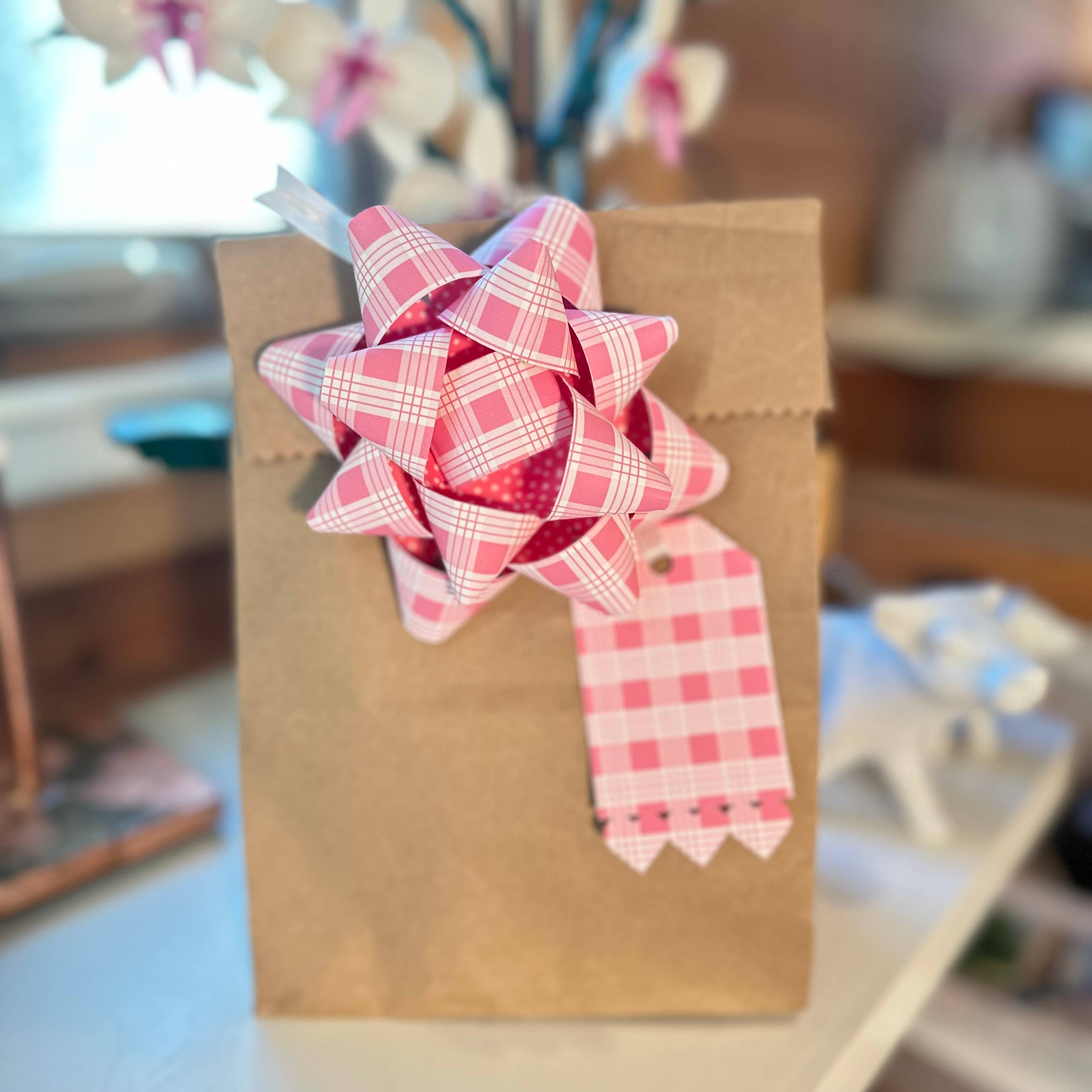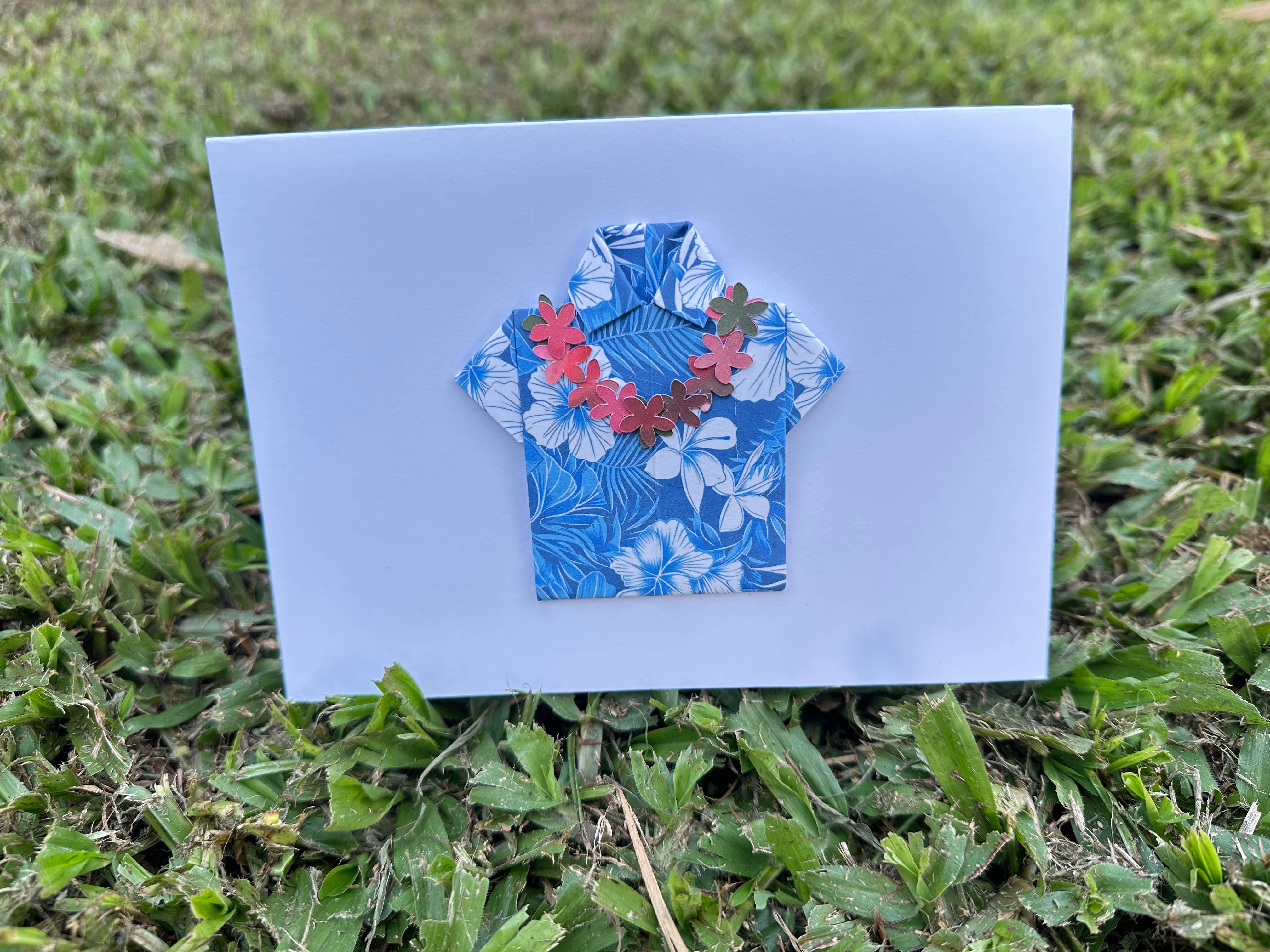 Handmade origami heart card Hawaiian palaka print. Purple, Red or Pink. Card with envelope is packed in compostable clear sleeve. Cards are 5" x 7". White or Kraft brown. Can be ordered blank or with greeting on the front. Happy Valentine's Day or Happy Birthday.