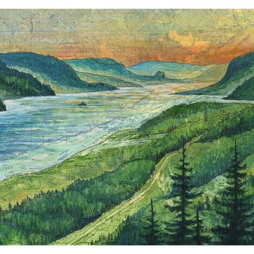 Artwork Details: Crown Point feels like a threshold—the gateway to the Columbia River Gorge and to something bigger than ourselves. I created this sunset scene in pinks, purples, and greens to capture that expansive, breath-catching view as the river winds through the ridgelines. Embossed in the sky is John Muir’s line, “The power of imagination makes us infinite.” For me, this piece is about awe—the way standing at the edge of something vast stretches who we are. Print Details: Size: 8x10 print of my original mixed media collage artwork described above. Printed on high quality, 100 lb recycled white matte cardstock with archival ink. Small white border for framing.
