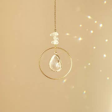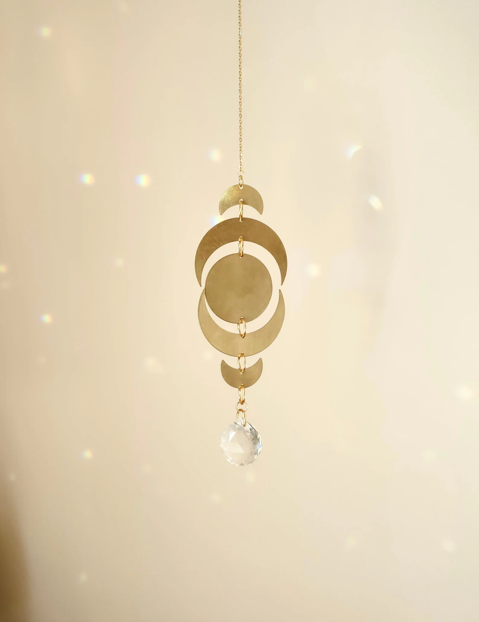 ✨ A true little interior gem, the suncatcher is used in the art of Feng Shui. It is the visual equivalent of a musical chime, whose purpose is to harmonize the energies of your environment. 🌈 When a ray of sunlight passes through the glass prism, its multiple facets reflect all the colors in the light spectrum that radiate in all directions, spreading its soothing vibrations throughout your home. 🏻 Handmade with love in my small workshop between fields and forests. 🌿 💎 TIPS FOR USE & MAINTENANCE: Hang your suncatcher in front of a window exposed to sunlight and watch the rainbows dance on your walls as a ray passes through the glass prism. Your suncatcher is made of brass elements. To maintain its shine and restore its brilliance, clean it if necessary with a suitable product such as “copper mirror”, by rubbing with a soft cloth.