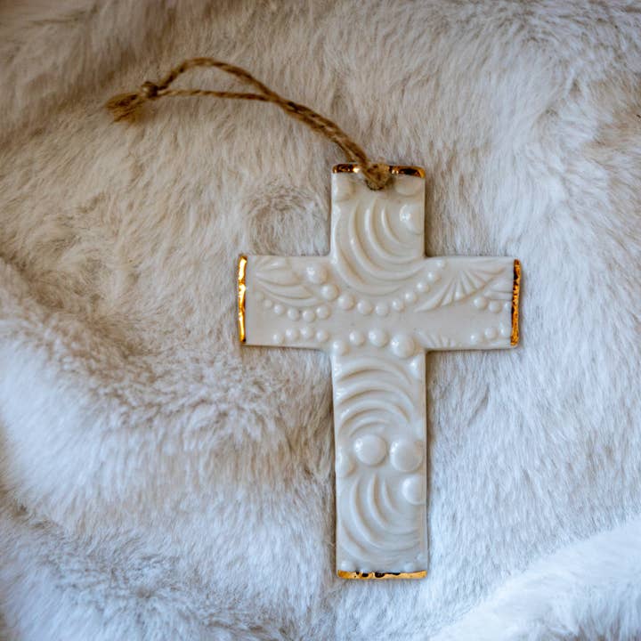 Porcelain Bone China Bauble is approximately 3 inches tall, accented with 22k Gold Luster, tied with red velvet ribbon (red & green variation) / white satin ribbon (green & gold variation). All Sojourn Studio items are beautifully handcrafted by women artisans on the Thai-Myanmar border. Each piece is unique and may vary slightly in design and in size. Pieces are delicate. Please handle as you would fine china.