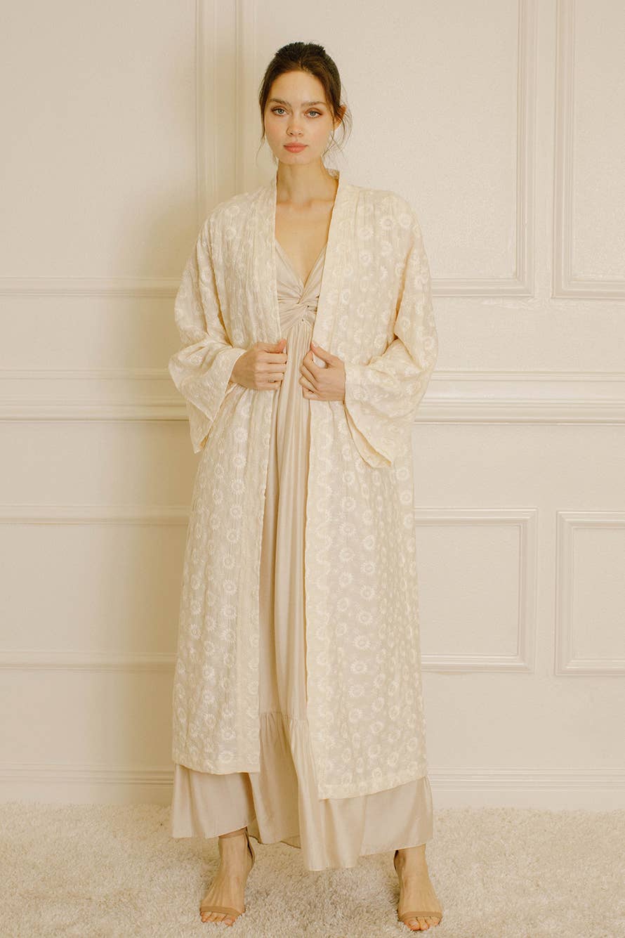 Stunning floor length white linen goddess robe trimmed with fluffy beige pom poms. Made from lightweight cotton with a crinkled texture. Features a flattering A-line cut and large draped hood. A versatile and elegant robe that can be worn as a top layer, ceremonial priestess dress, beach cover-up, or fantastical festival costume. It can be paired with the sandwind fringe or sandwind nomad hood to add a mystical look to your outfit. SIZING: * ✦ Small: Up to 34" Chest, 86.5cm ✦ Medium: 36" Chest, 91.5cm (36"-28"-36" inch bust/waist/hip) ✦ Large: Up to 40" Chest, 101.6cm (40"-32"-42" inch bust/waist/hip) If you are unclear about your size or have a bust/waist/hip measurement that can fit 2 sizes, choose the size that best corresponds to your chest measurement.