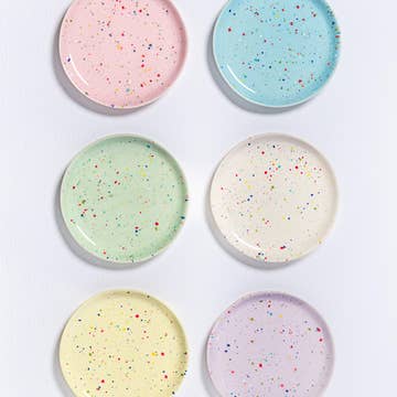 Introducing our delightful Party Bread Plate. This captivating piece is a true embodiment of joy, boasting an enchanting design that effortlessly complements any occasion. The Party collection, renowned for its vibrant and lively aesthetic, finds its ultimate expression in this bread plate. This very special Mix contains 1 piece for each color :) Dimensions: Diameter: 17cm Height: 1,6cm All our pieces are: Dishwasher and microwave safe. Food safe. Cadmium Free. Material: Stoneware with less than 3% absorption. Our Party Collection features a special type of glaze that may exhibit areas where speckles become diffused due to the glass's reactive nature during processing. We find these unique, unpredictable variations to be the most beautiful aspect of the glaze. Bread Plate is a testament to our commitment to producing unique and exceptional tableware. Our artisanal process ensures that no two pieces are exactly alike, celebrating individuality. Please note that glaze colors may slightly vary due to production techniques. If you have any queries or seek more information, please don't hesitate to reach out to us. The blue in this set has been updated to a softer, lighter shade, bringing an even more serene touch to the collection.