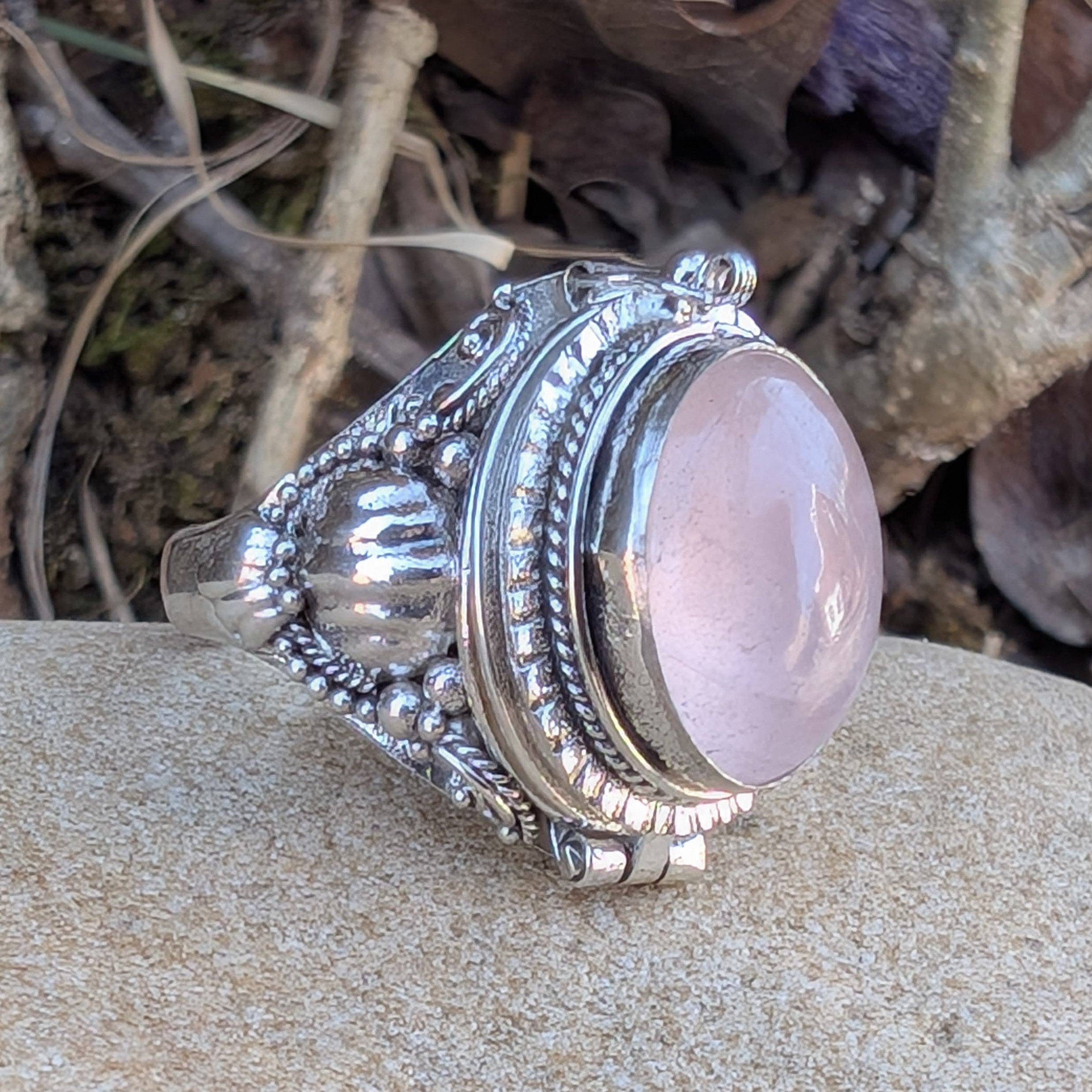 * Genuine Gemstone (5mm) Square * Weighs Approximately 6.2 Grams * Top is 5/8" Wide * Marked .925 This sterling silver ring has a small secret compartment and is set with a square genuine gemstone. It closes with a latch and is perfect for holding tiny pills, written prayers, a lock of hair, or other small important keepsakes. Handcrafted of sterling silver and marked 925.
