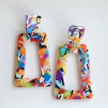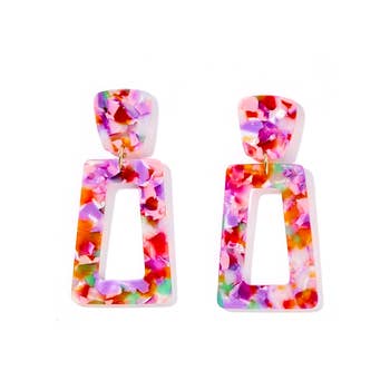 Add a burst of color to your accessory lineup with these vibrant acrylic earrings. Featuring a bold paisley-inspired print in pink, teal, green, and orange, these rectangular dangles are perfect for summer, vacation, or festival collections. Lightweight and eye-catching, they’re finished with textured gold-tone stud tops for a touch of shine. The open rectangle design offers a flattering shape with easy, all-day wear. Great for boutiques seeking colorful, fun statement pieces. Details: - Material: Acrylic, stainless steel gold-tone posts - Length: Approx. 2" Bright, playful, and perfect for customers who love bold, standout jewelry.