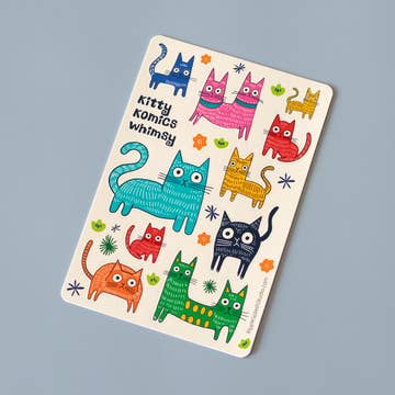 A sticker sheet of six abstract black cats doing various funny cat things. The background is green, the cats are black and white. This sticker features a matte finish, and the full sheet measures 4.75inx4.75in (12cmx12cm)