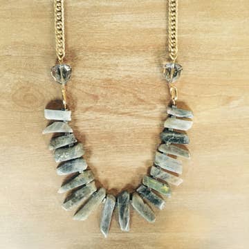 SKU: N042 Made in Canada Color: Black, Green, Multi-Colored, Off-White, and Yellow Gold Is Set: Individual Material: Gold Filled and Stone Stone Type: Labradorite and Zoisite Weight: 17.01 g (0.6 oz) Packaging: Recyclable and Recycled Production: Ethically sourced