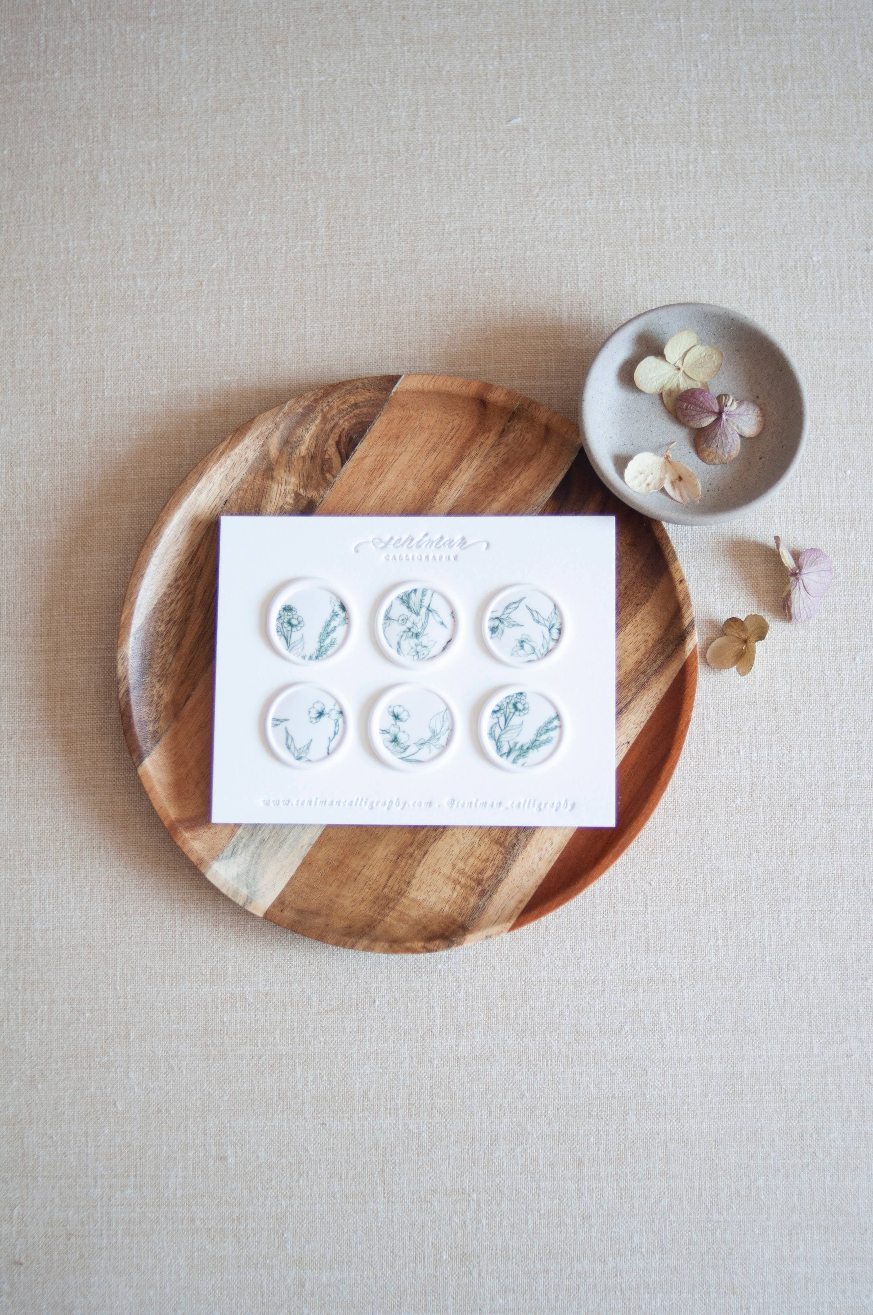 Set of 6 wax stickers in gold with our exclusive Botanical Wax Stamps. We have more than 9 different botanical designs and constantly adding more to our collection. Each stamp is made with a 1" wax stamp and each set will be a random selection of 6 different designs. Due to the handmade nature of the stamp, no two stickers will be identical. Packed with A2 ivory cotton paper. Each wax seal comes pre-glued with a double-sided backing on the back.