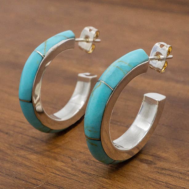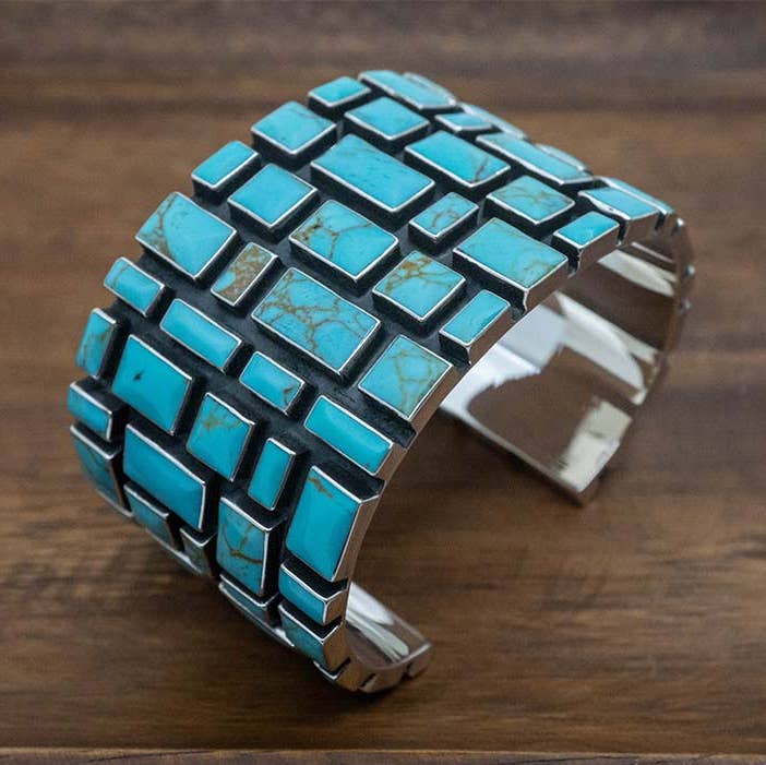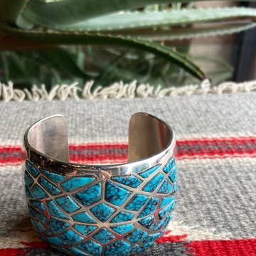 What a statement piece! This gorgeous mosaic of hand cut turquoise stones wraps around your wrist and sends a message of cool confidence! Also available in red jasper, BC1301R.