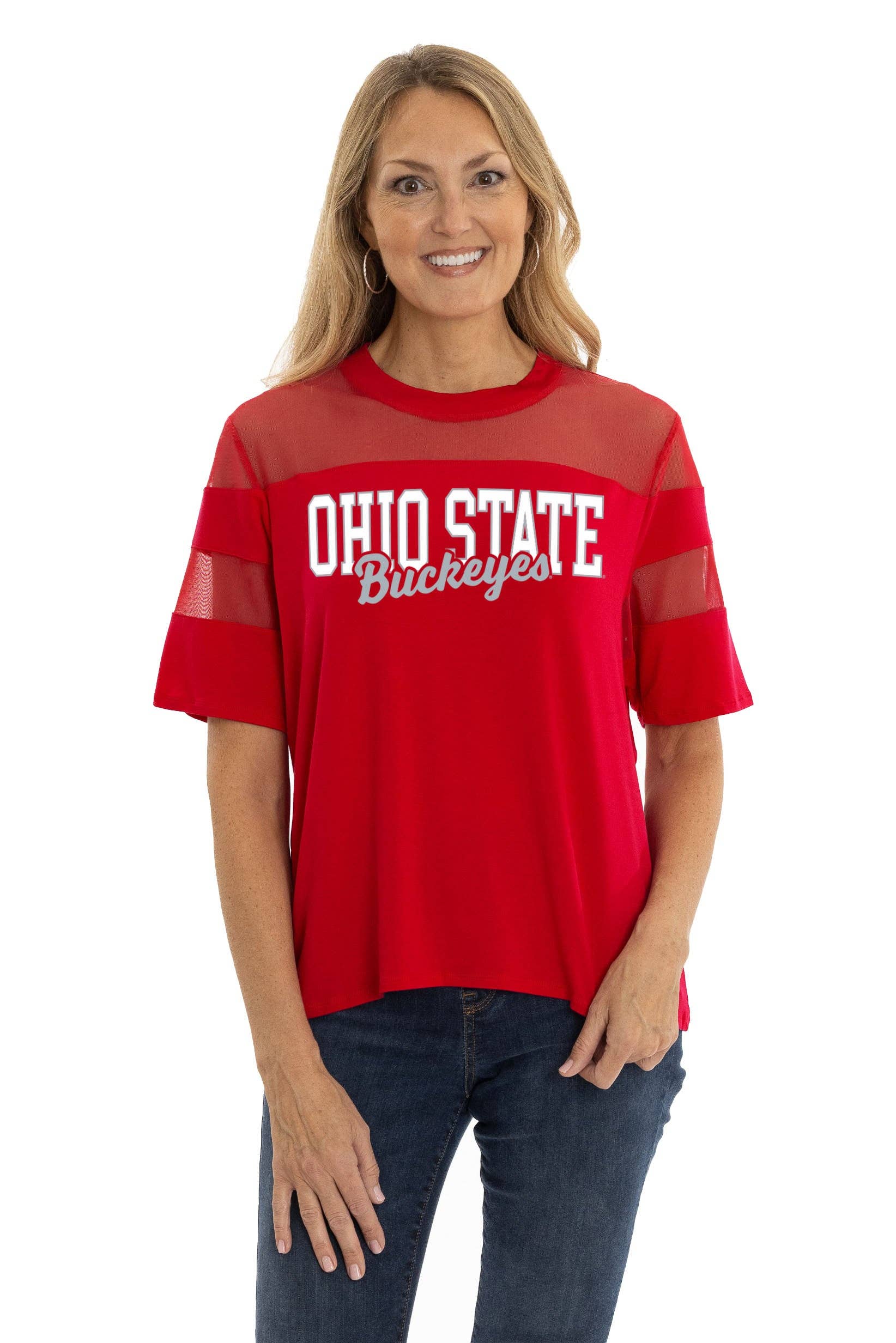 A ruffle sleeve hem and subtle tie day fabric sets this Ohio State Buckeyes tee apart. Features v-neck and baby French terry fabric. 70% Poly, 27% Rayon, and 3% span. NCAA officially licensed.