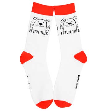 For the dog lover who’s a little more ruff around the edges. These white novelty socks feature navy blue toes, heels, and cuffs, plus a cartoon dog giving the universal “not today” gesture, paired with the bold text “Fetch This.” It combines a cute character and confrontational design, like a pug with an attitude problem. Made from 70% cotton, 28% polyester, and 2% elastic, they’re soft, breathable, and tough enough for long walks, lazy days, or side-eyeing anyone who dares to ask for a favor. One size fits most (Men’s 6–11, Women’s 7.5–12), so they’re a great gift for pet parents, sarcastic friends, or anyone who enjoys mixing a little bite with their bark. Machine washable for easy care, these socks keep your feet cozy while letting the world know exactly where you stand. Or sit. Tail wag optional.