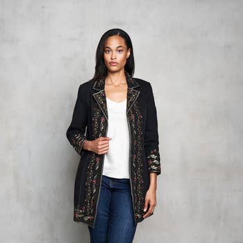 This exquisite short coat jacket is a masterpiece of fashion, featuring intricate hand-embroidered designs and lavish beading. The black fabric is adorned with a stunning array of pearls, diamonds, and gold thread, creating a rich tapestry of patterns, including paisley and geometric motifs. The jacket's lapels and sleeves are heavily embellished, making it a statement piece perfect for high-end events or adding a touch of opulence to any outfit. The meticulous craftsmanship and attention to detail make this jacket not just a piece of clothing, but a work of art.