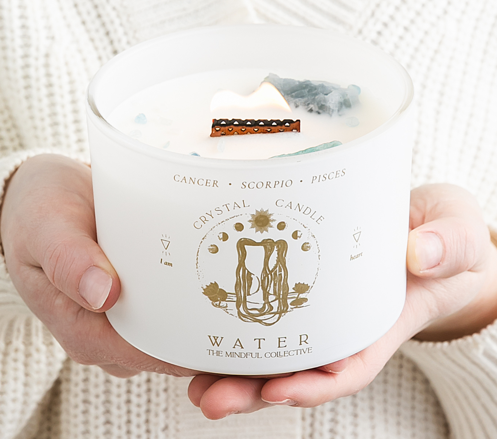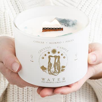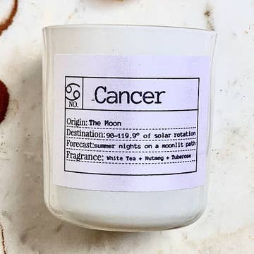 Protective, Emotional, Charming Say hello to our Cancer-inspired candle, a serene blend crafted to capture the nurturing and intuitive essence of this water sign. Refreshing notes of sea salt & mint join with delicate peony & grounding juniper to embody the soothing and protective nature of Cancer's energy. With each burn this candle creates a tranquil ambiance that invites you to reflect and recharge. This smooth candle promises to evoke the heartfelt warmth of Cancer's embrace, making it perfect for enhancing any living space. This 8 oz. candle has a crystal that has been hand selected to amplify the Cancer energy it gives as it's burning. Cancer candles with a crystal will include an intuitively selected moonstone or aquamarine. Scent Profile: Top Notes - Bergamot, Sea Salt Middle Notes - Peony, Mint Base Notes - Marine, Juniper, Light Musk