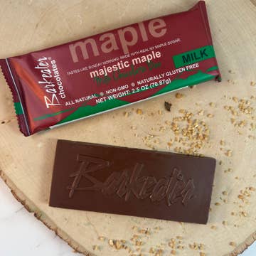 Made in United States Contains: Milk and Tree nuts Diet: Gluten-free, Grain-free, Soy-free, Vegetarian, and Whole Foods Production: No artificial sweeteners and Non-GMO Season: Year-Round Shelf life: 12–24 months Storage: Shelf-stable Product Language: English Ingredients: INGREDIENTS: Milk Chocolate (sugar, cocoa butter, milk, unsweetened chocolate, vanilla), Maple Oil (flavor, sunflower oil), Maple Sugar. CONTAINS MILK, MAY CONTAIN NUTS. Weight: 70.87 g (2.5 oz) Dimensions: 15.2 x 1.3 x 6.4 cm (6 x 0.5 x 2.5 in)