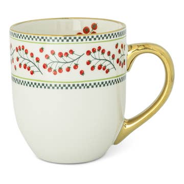 Stoneware mug thrown on the wheel in reclaimed clay with a handle attached by hand. Bisque fired once when dry, stamped, waxed and decorated using a series of glazes. The piece is then placed back in the kiln for its final 1230 degree centigrade glaze firing. Each piece is decorated by hand making each mug completely unique. Dishwasher and microwave safe though discouraged for longevity. Approximately 9.5cm wide x 9.5cm tall