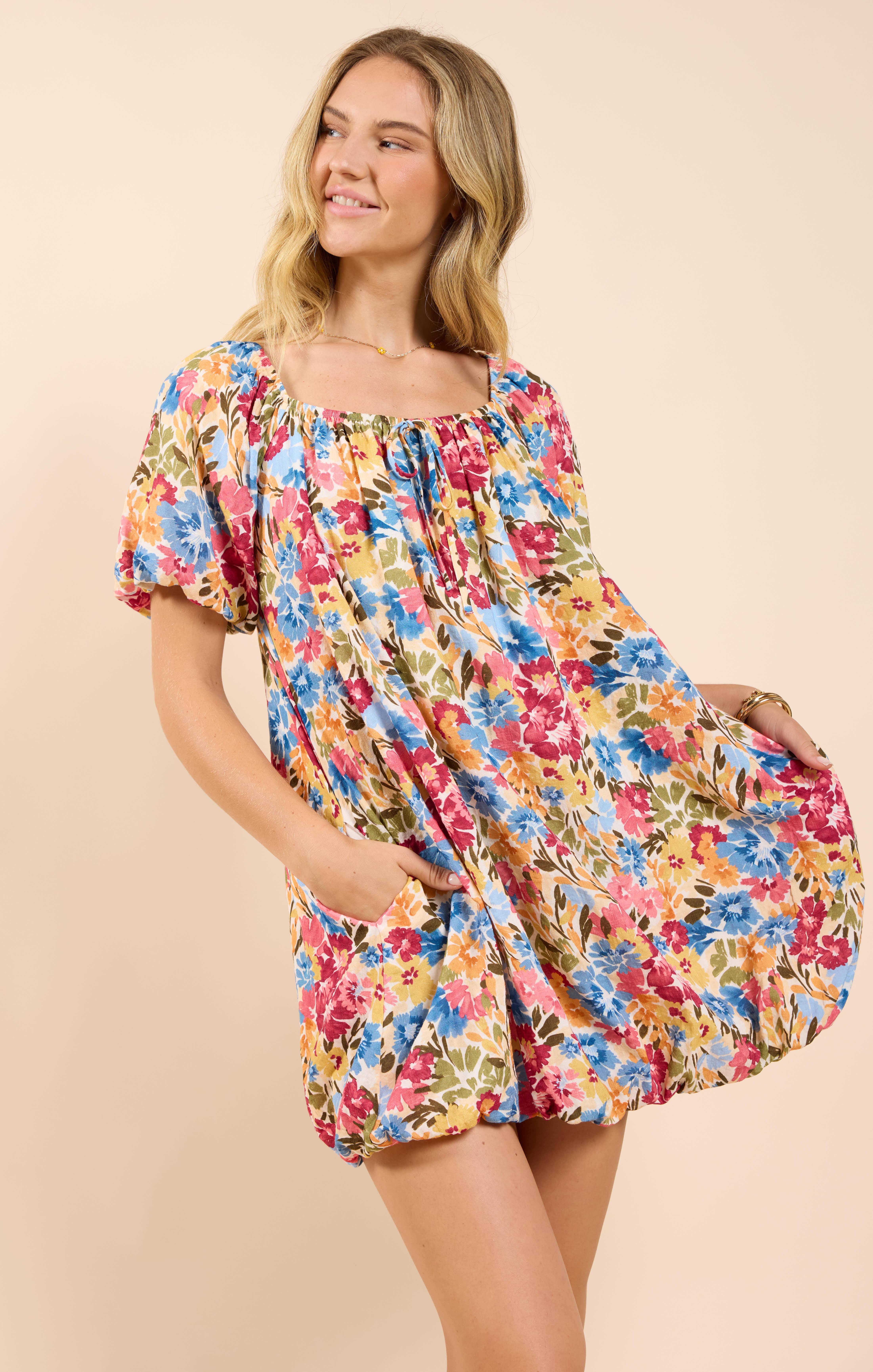-FLOWER PRINT ON WOVEN FABRIC -V NECK -DOLMAN SHORT SLEEVE WITH CUFF BAND -MINI LENGTH -BABYDOLL WAISTLINE MODEL IS 5'9" AND IS WEARING SIZE SMALL