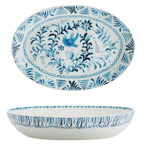 Bring a lively look to your tabletop when you serve sides with this Sicily Green Oval Serving Bowl and Serving Platter by Fitz and Floyd. Both are crafted of durable stoneware for strength and durability, this charming set is adorned with vibrant green floral designs and both are generously sized to hold a variety of main meals. sides, salads, or pasta. Set includes one 4 quart oval serve bowl measuring 14-1/4 inch long by 11-1/2 inches wide by 3-inches high and one serving platter measuring 16-1/2 inches long by 11-1/2 inches width by 1-1/2 inches high. Dishwasher and microwave safe.