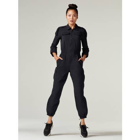 FEATURES & BENEFITS Effortless street style, The Mastermind Flightsuit. Functional Pockets for storage on the chest and legs. Features detailing on shoulders and sleeve cuffs. Adjustable elastic waistband, and hem. * Zipper Pockets * Elastic Waist & Hem Adjustable * Elastic At Hem FABRIC CONTENTS Shell: Technical Knit (77% Nylon 23% Spandex) Our Technical Mastermind Fabric is a dry to the touch 77% Nylon/23% Spandex fabric that stretches and gives all the ways you move during the day. It keeps its neat appearance and is the ultimate easy care/easy wear fabric and a signature of this collection Lining: Stretch Poly Satin (95% Polyester 5% Spandex) Model is wearing a size Small.