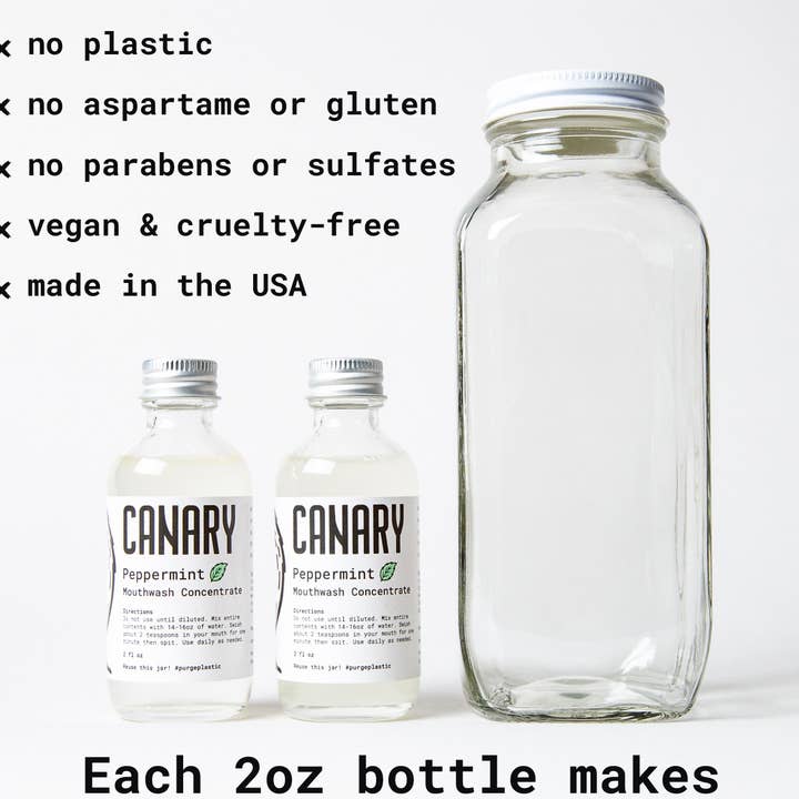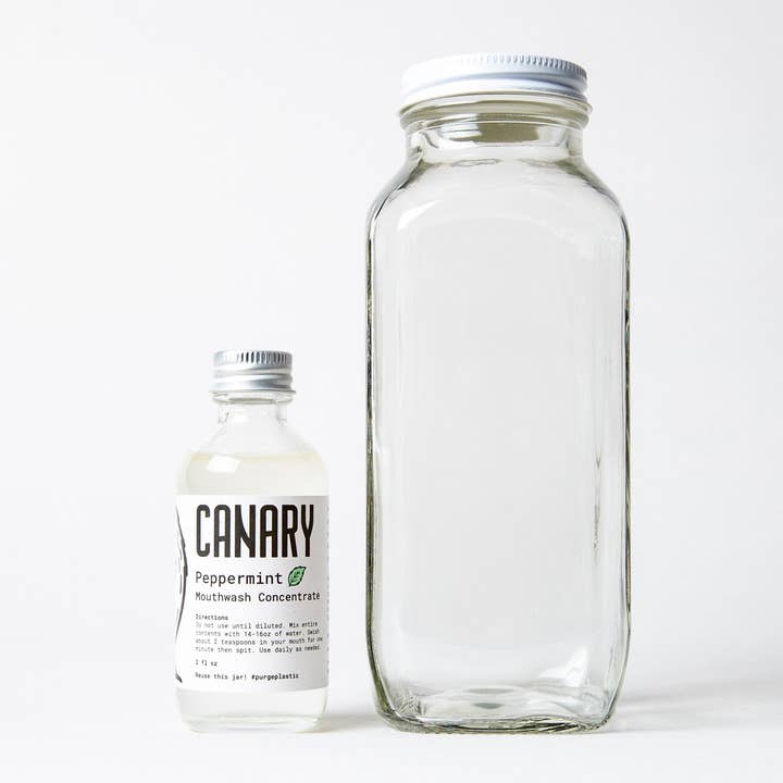 Purchase our popular Peppermint Mouthwash Concentrate in 1 gallon jugs for your bulk refill shops. Each 1 gallon has about 64 pours of our 2oz portion, and each portion makes 16oz of refreshing mouthwash. You can also purchase our containers separately a la carte as well. General Terms: * Canary products cannot be repackaged and sold individually online or any other marketplace * Products cannot be returned * Canary not responsible for any product damage due to mishandling or improper storage * Shipping negotiated per size of each order * For large orders, please allow a few days to pack and ship.