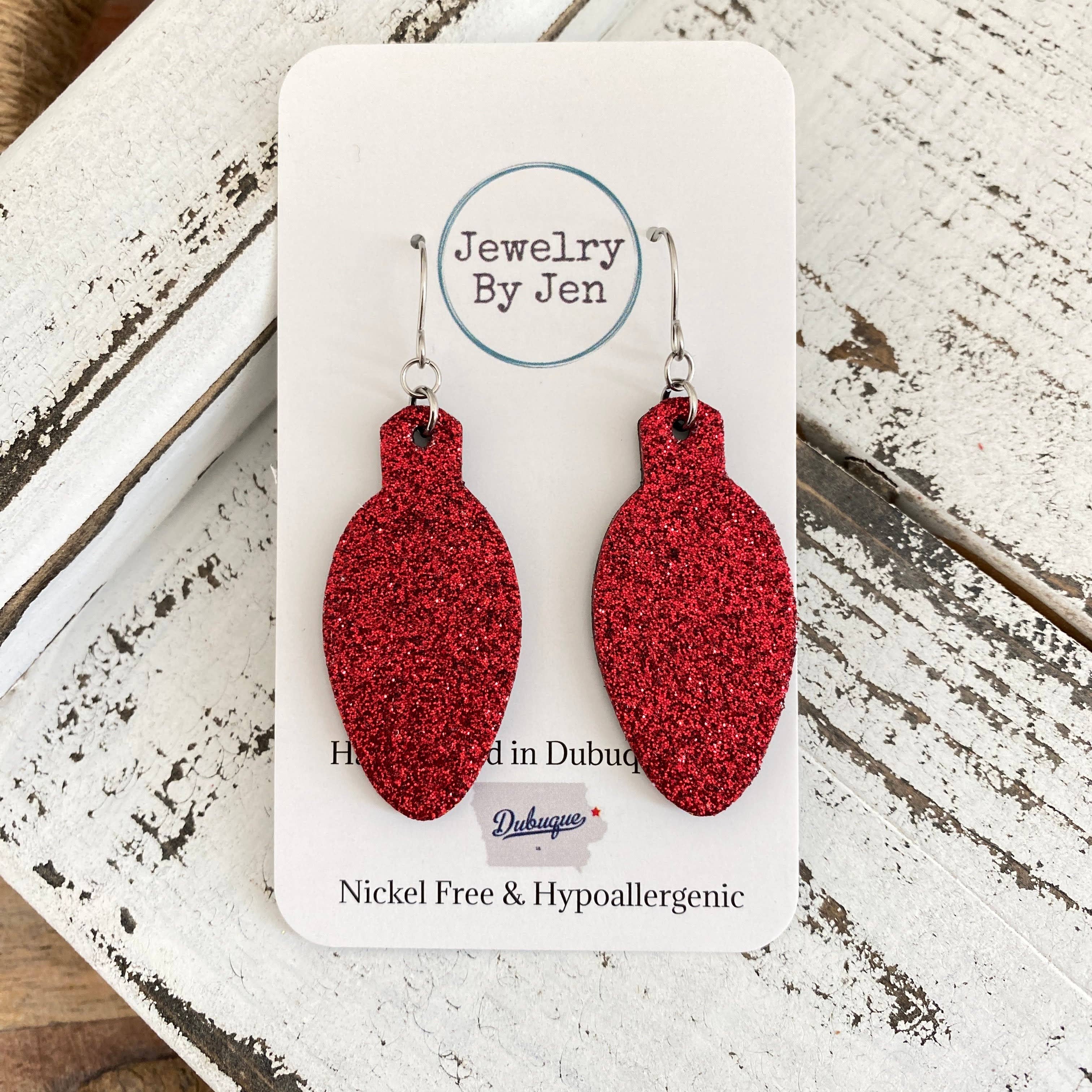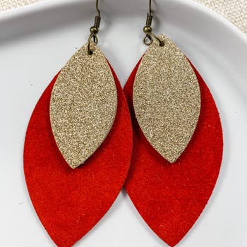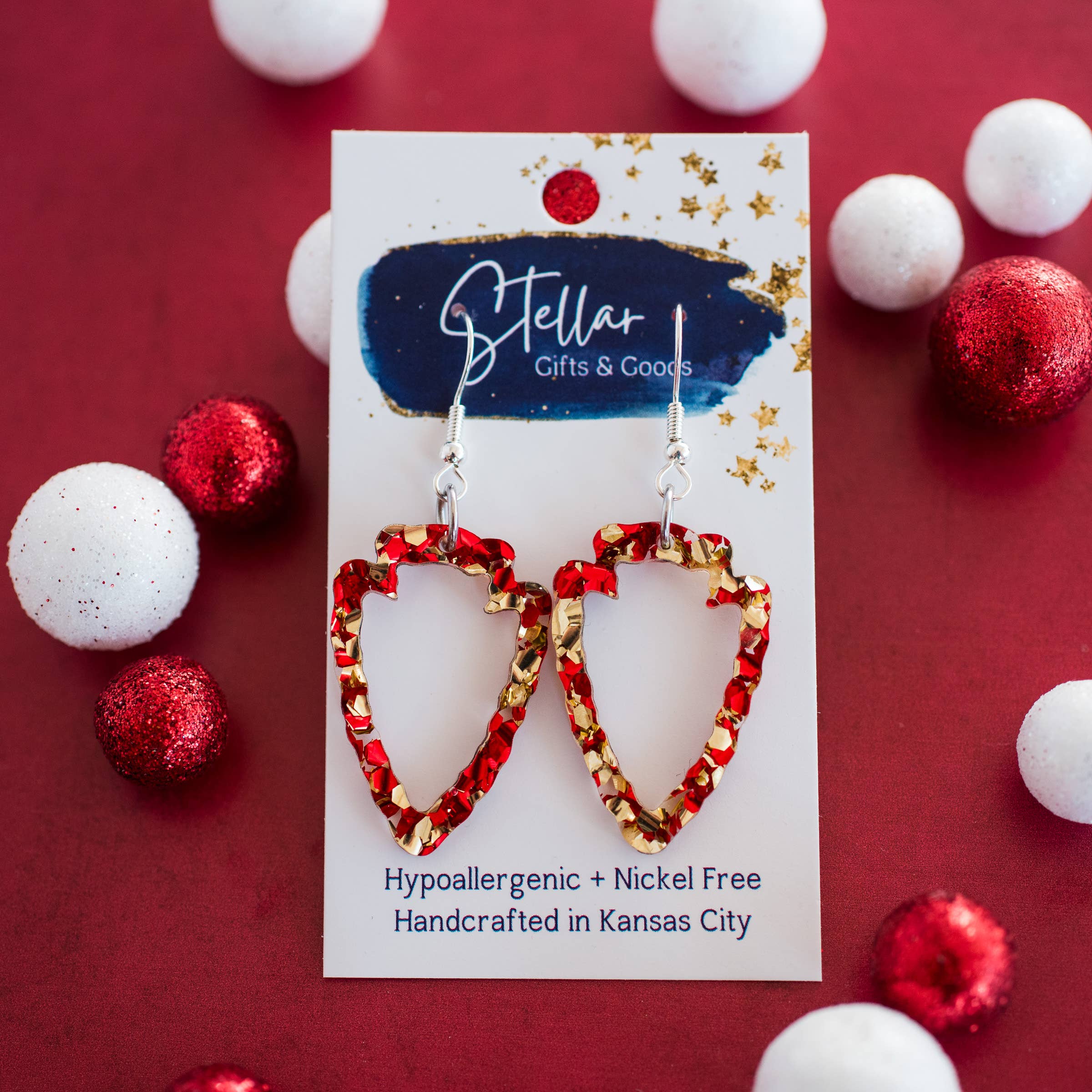 Large chunky red & gold glitter arrowhead dangle earrings. 2 inch length. Great for sensitive ears! Material: Glitter acrylic Findings: Silver plated iron, Hypoallergenic, Nickel Free, Lead Free, Cadmium Free Earrings come packaged on a card with silicone backs. Handcrafted in Kansas City, MO