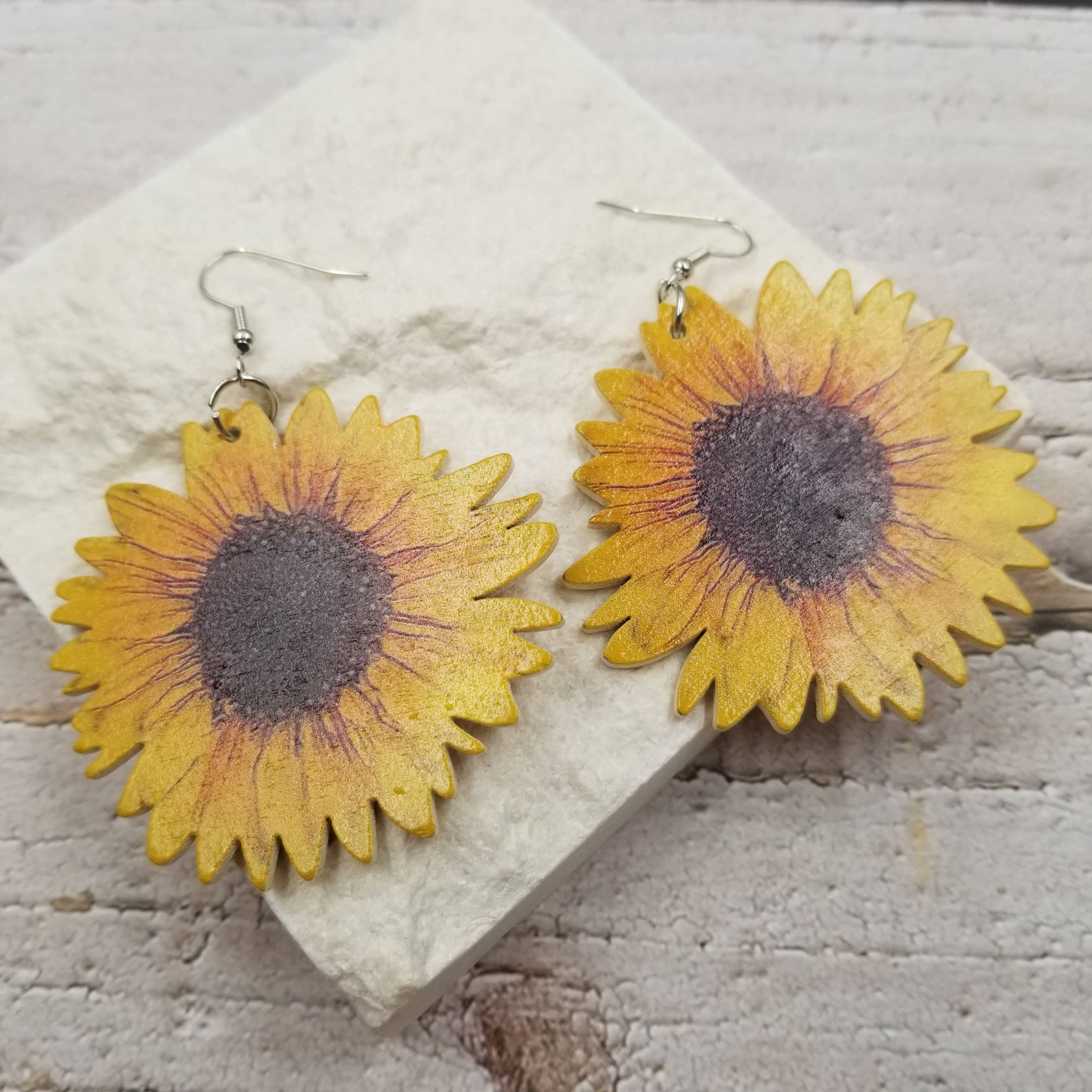 Celebrate summer’s golden glow with these stunning large round drop earrings, crafted from lightweight polymer clay and available in 13 vibrant, speckled summer colors. Each circle features a beautifully hand-painted antique gold embossed sunflower delicately positioned in one corner, adding a touch of vintage charm and sunny warmth. Finished with a unique arch-shaped stained wood ear post, these earrings blend natural elegance with artisanal detail. The hypoallergenic stainless steel post ensures comfortable, all-day wear for sensitive ears. Approximate size: 1 ½" wide x 1 ½" long Lightweight, comfortable, and perfect for adding a bold burst of sunshine to any outfit.