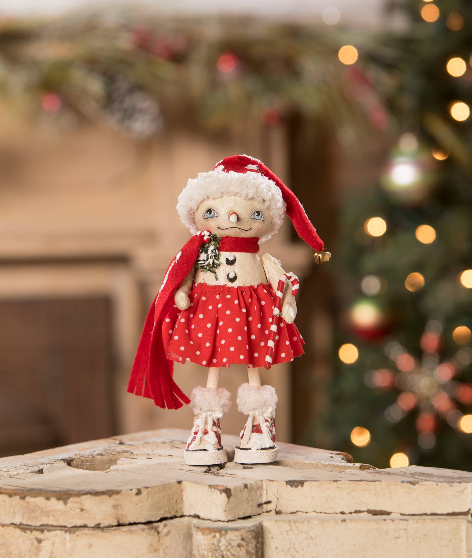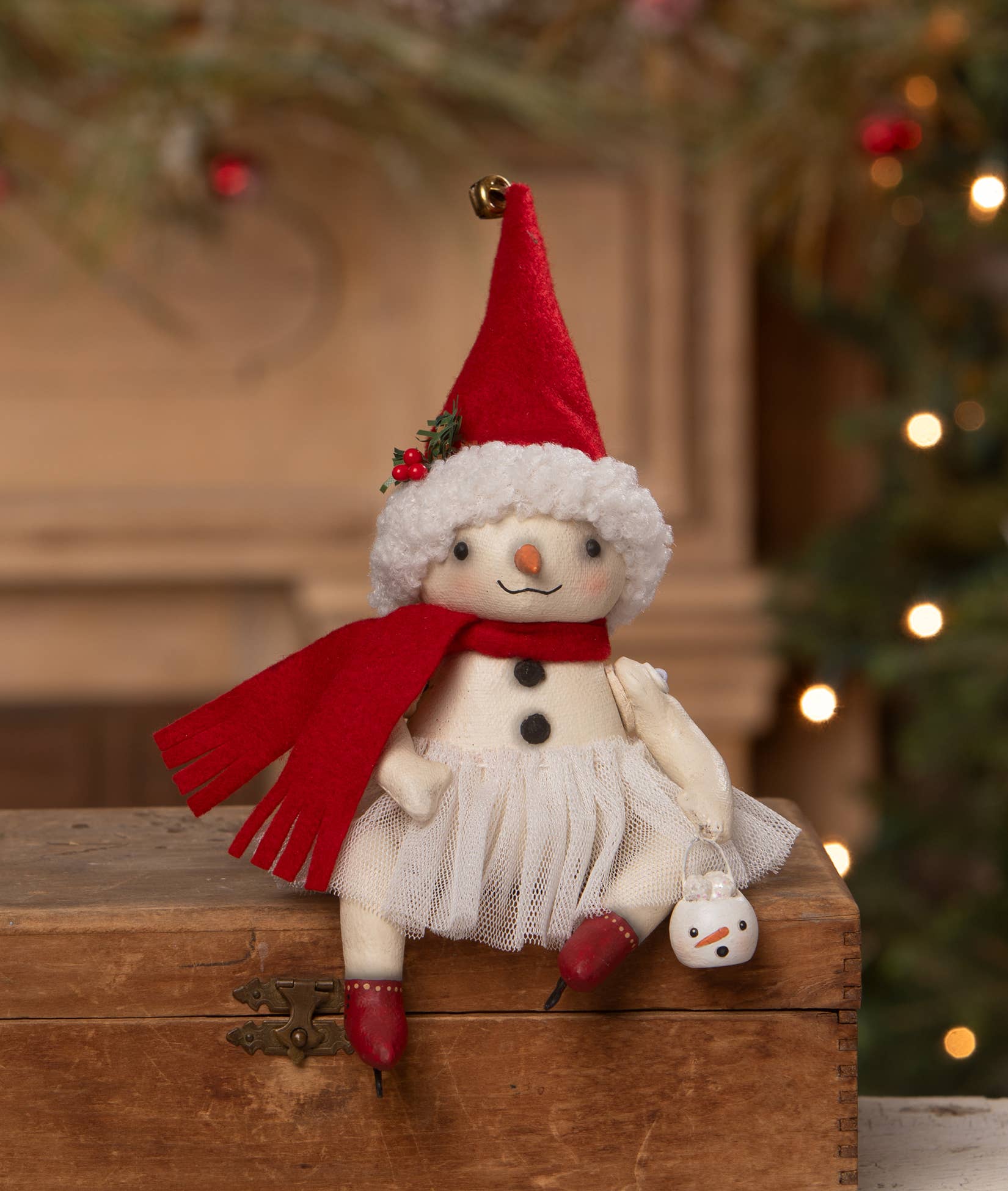 Introducing a delightful new design by robin seeber, bing flake is full of festive charm! Dressed in a classic black top hat and a cozy red scarf, he’s ready to spread holiday cheer. Holding a bottle brush tree and sporting a pair of homemade ice skates, this snowman is ready for frosty fun. With movable arms and legs, he’s a perfect addition to your holiday collection! Hand-painted resin, fabric, faux greenery, glitter, bottle brush, and wire.