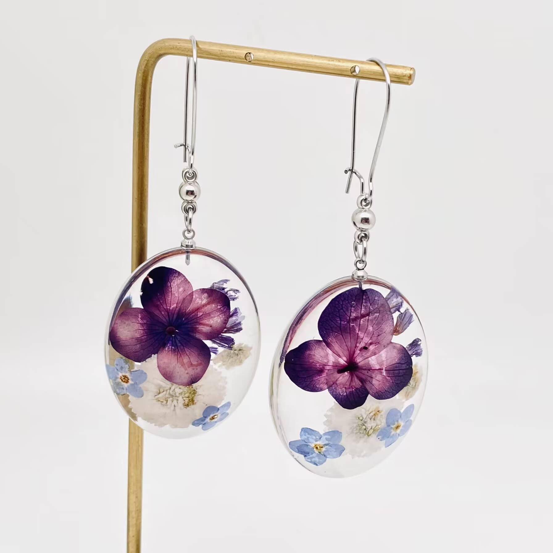 Real flower blossoms, petals and leaves, pressed, preserved, and encased in multiple layers of glass-hard crystal clear jeweler’s resin, with UV protection, using our proprietary process. Sterling silver findings. Earrings or pendants are carded on a fold-over card. Each piece of The Petal Connection jewelry is hand crafted. Also available as a pendant, see separate listing.