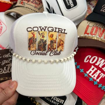 Our Champagne Cowgirl Embroidered Canvas Trucker Hat is the perfect addition to your elevated western look. This hat is a stunning dark green and embroidered with champagne thread. This trucker is perfect for Stagecoach. -Structured front -Adjustable plastic snap -5 Panel Mid Profile