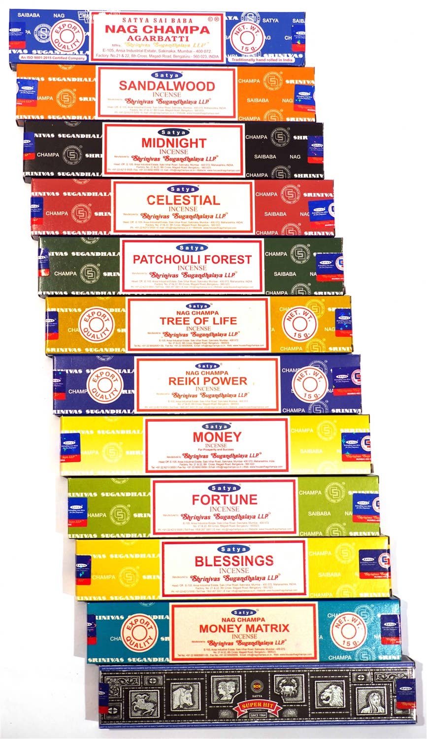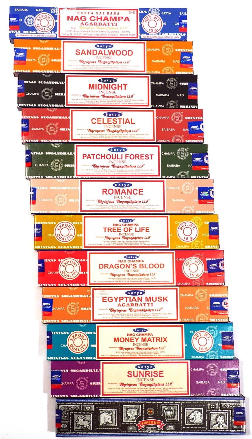 Gift Set of 12 boxes of 15g each of different scents, total 180 g Genuine Satya Brand incense from the company that brought you the original world famous Nag Champa. The Preparation consists of formulation of masala mix using natural extracts in the form of dough concerning the ancient method and is rolled by hand on the bamboo sticks. Satya Sai Baba Nagchampa is a combination of Champa flower, floral, Oriental-Spicy aroma with a base note of wood and patchouli. It is a reminiscent of Jasmine or magnolia flowers. The aroma that emits from this agarbatti creates a soothing and calm environment. Scents include: Nag Champa Sandalwood Midnight Patchouli Forest Celestial Spiritual Aura Reiki Power Nirvana Palo Santo Sacred Ritual California White Sage Super Hit Authentic, hand rolled masala incense imported from India. Message or call us for case and pallet information.