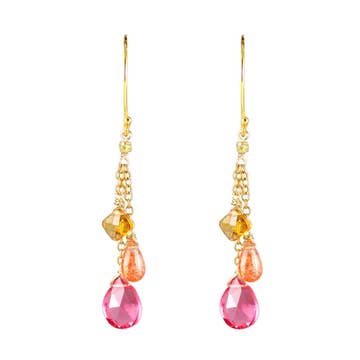 Chain threader earrings with a double drop of a pikake shaped beads. Pikake is a flower we adore here on Kaua'i both for lei making and the heavenly scent that powerfully emanates from this small, intricate flower. Size — 0.75" (Front), 1.75" (Back) Color — Pink Material — 14k gold fill + pikake shaped from resin Please note that due to the handmade nature of our jewelry, variations in size, hammered texture, bead color, and other details may occur. Each piece is uniquely crafted with care, making every item truly one-of-a-kind.