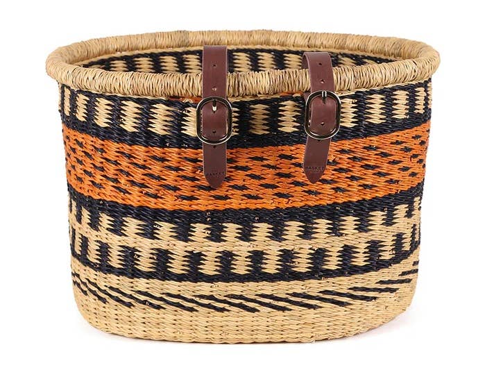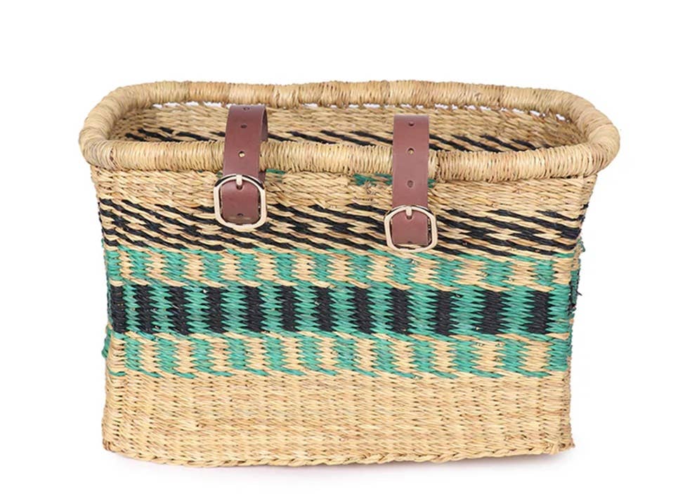 Bike Basket| Front Bicycle Basket | Woven Bike Basket These bike basket are handmade with the finest elephant grass in Ghana. Elephant grass is a tough fiber. Because of its solid texture and strength, the basket can be washed in water. The bike basket is beautifully handwoven and built to last for years without any maintenance required. The bike basket feature a distinctive and complimentary design and pattern to give an elegant and luxurious look and feel. The artistic combination of the stalks display a beautiful modern artwork. Each basket comes crafted with leather straps for hanging and extra sophistication. This bike basket natural is versatile, durable and a sweet addition to your home.
