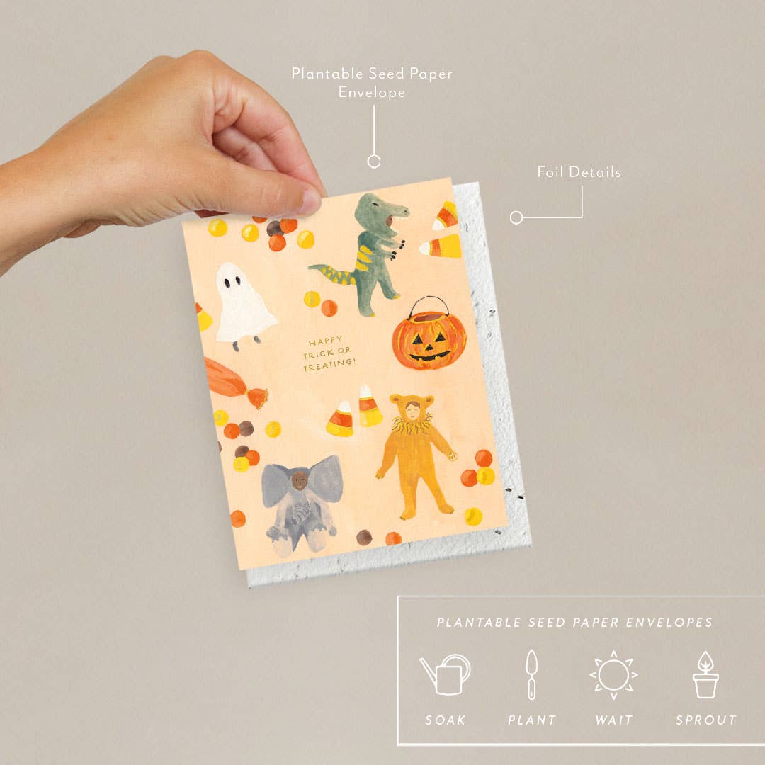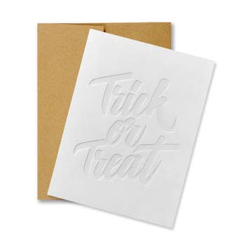 The one that makes your customers smile before they even pick it up. A hand-illustrated spider dangles from its web alongside quirky hand-lettered 'spooky season' — playful enough to feel fun, charming enough to feel intentional. It captures that collective excitement when fall hits and everyone suddenly becomes a Halloween person. That lighthearted energy is what gives this card range beyond October 31st. Customers reach for it starting in September when the first cool breeze triggers pumpkin-spice-and-skeleton-decoration mode, and it keeps moving through the entire fall season. The spider illustration reads as whimsical rather than creepy, which means it appeals to the customer who wants Halloween spirit without the horror movie vibes. - Hand-illustrated spider and web paired with playful hand lettering gives this card personality that stands out against generic Halloween designs - Whimsical tone appeals to customers who love spooky season but shop for charming over scary, broadening your buyer pool - Extended selling window from early September through October makes this a stronger performer than cards tied strictly to Halloween night - Letterpress printed on cotton paper with tactile impression - Blank inside for a personal message - Includes signature envelope Merchandise this face-out at the front of your Halloween display or near your fall seasonal section. It catches the early-season browsers who come in looking for autumn cards and stay for the Halloween charm. Pairs well alongside more spooky or gothic designs to give your display tonal range that keeps different shoppers engaged. This is the card your customers send to the friend who starts their Halloween countdown in August. That enthusiasm is contagious, and the quality ensures it ends up taped to a cubicle wall or stuck on the fridge for the entire season.