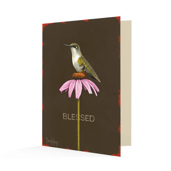 * 5" x 7" notecards. * Original Artwork by David Arms * Printed on heavy-weight stock * Premium kraft envelope(s) * Single Notecard packaged in clear sleeve * 8-Pack includes 8 Notecards (9 envelopes) in high-quality clear box * Blank inside. * Text on back: “Hummingbirds are an image of perpetual motion. When you do see one still, it is a bit of a shock. Like us, being still can seem unnatural. Here one sits, still, suspended by God. It’s in that stillness that God grows our souls and quiets our hearts.” * Made in the USA