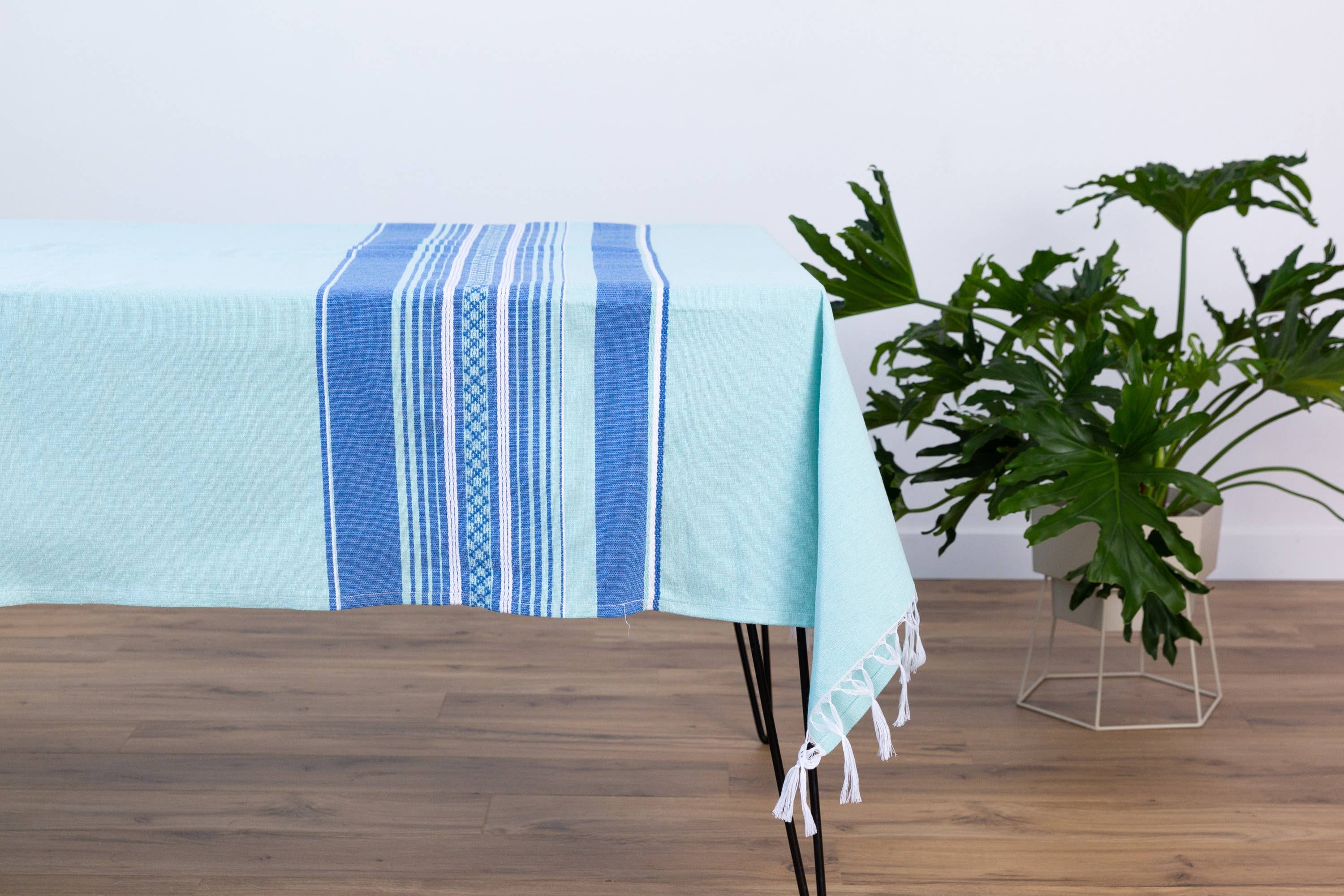 Add some variety to your kitchen linens with this contemporary striped tassel tablecloth. Featuring French blue stripes on cotton fabric, the tassel edges contrast with the acts as a pretty accent that brings a casual style to your table. This tablecloth is perfect for tasteful kitchen linens for everyday use and outdoor decoration. Material: cotton, polyester, linen Size: 55"X55" square, 55"X70" rectangular Care: hand wash preferred